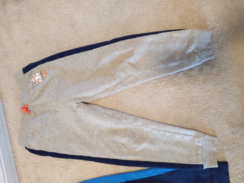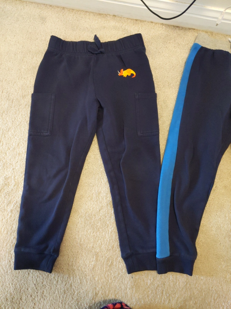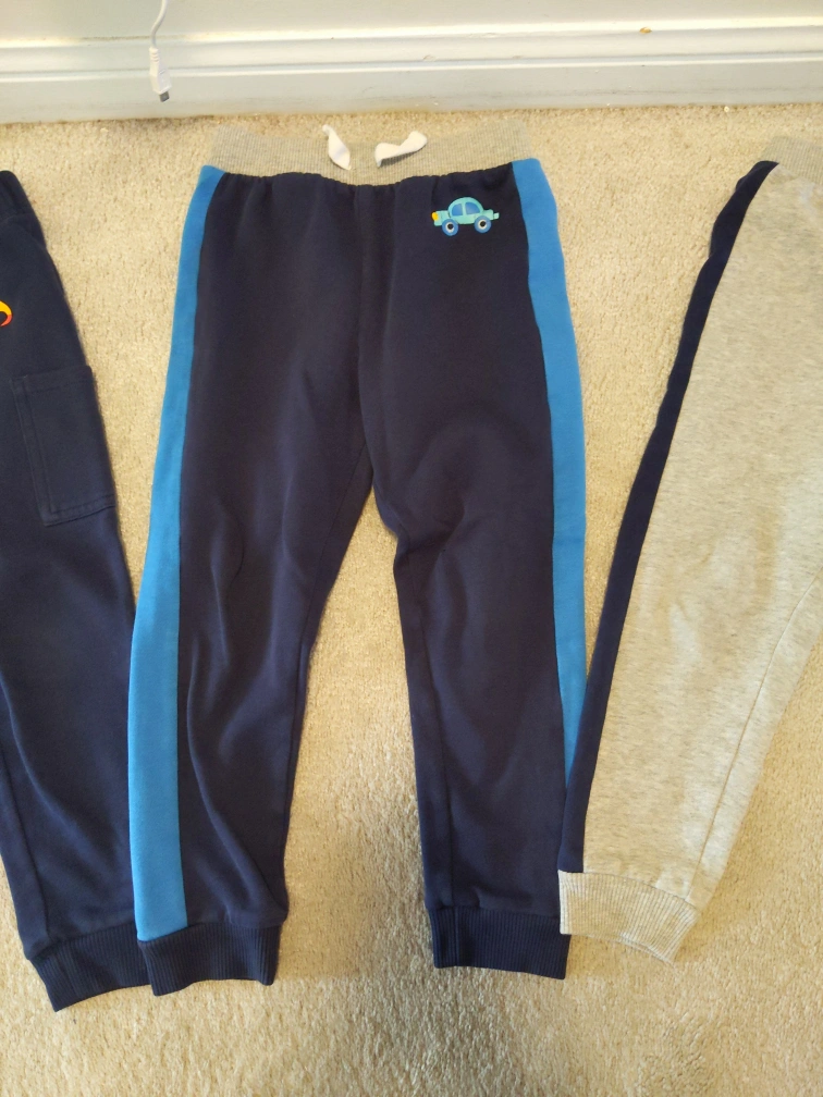 Three pairs of jogger pants. Two are navy blue with contrasting blue side stripes. One is grey with a blue side stripe. One is dark blue cargo style. All have unique embroidered designs. All are size 5T. They are very soft and comfortable to wear and play in. The condition is good. One is for $6 and all 3 are for $15. Payment is cash only and pickup only please buy!