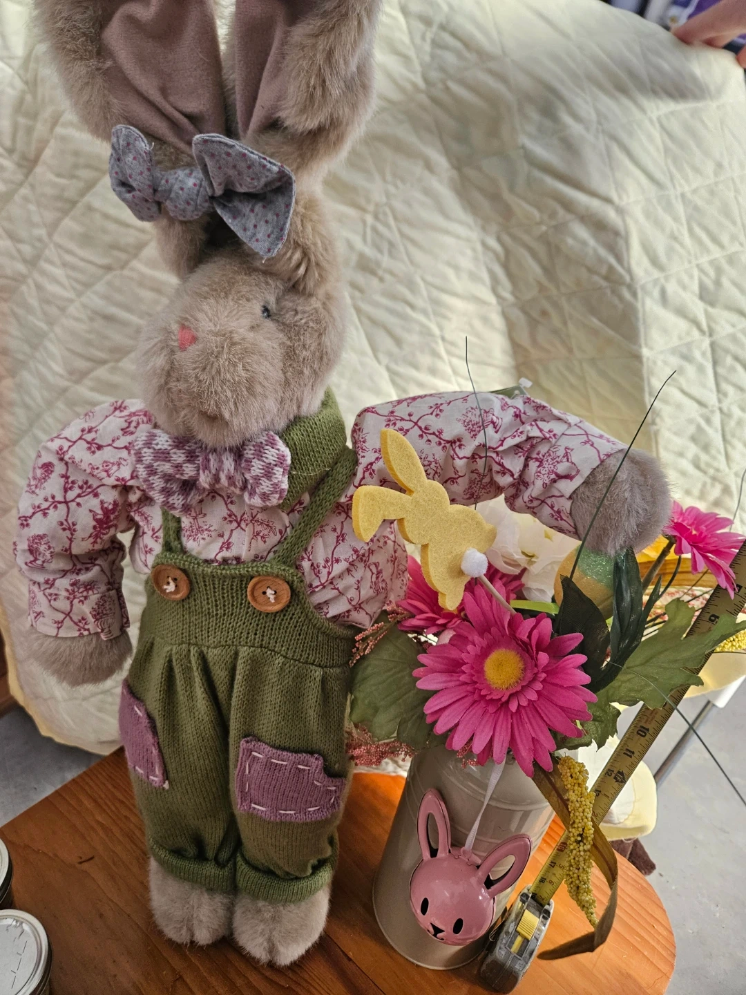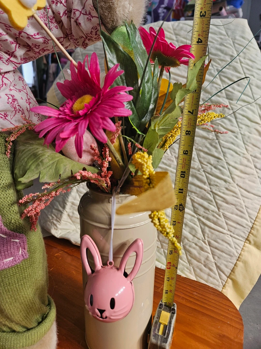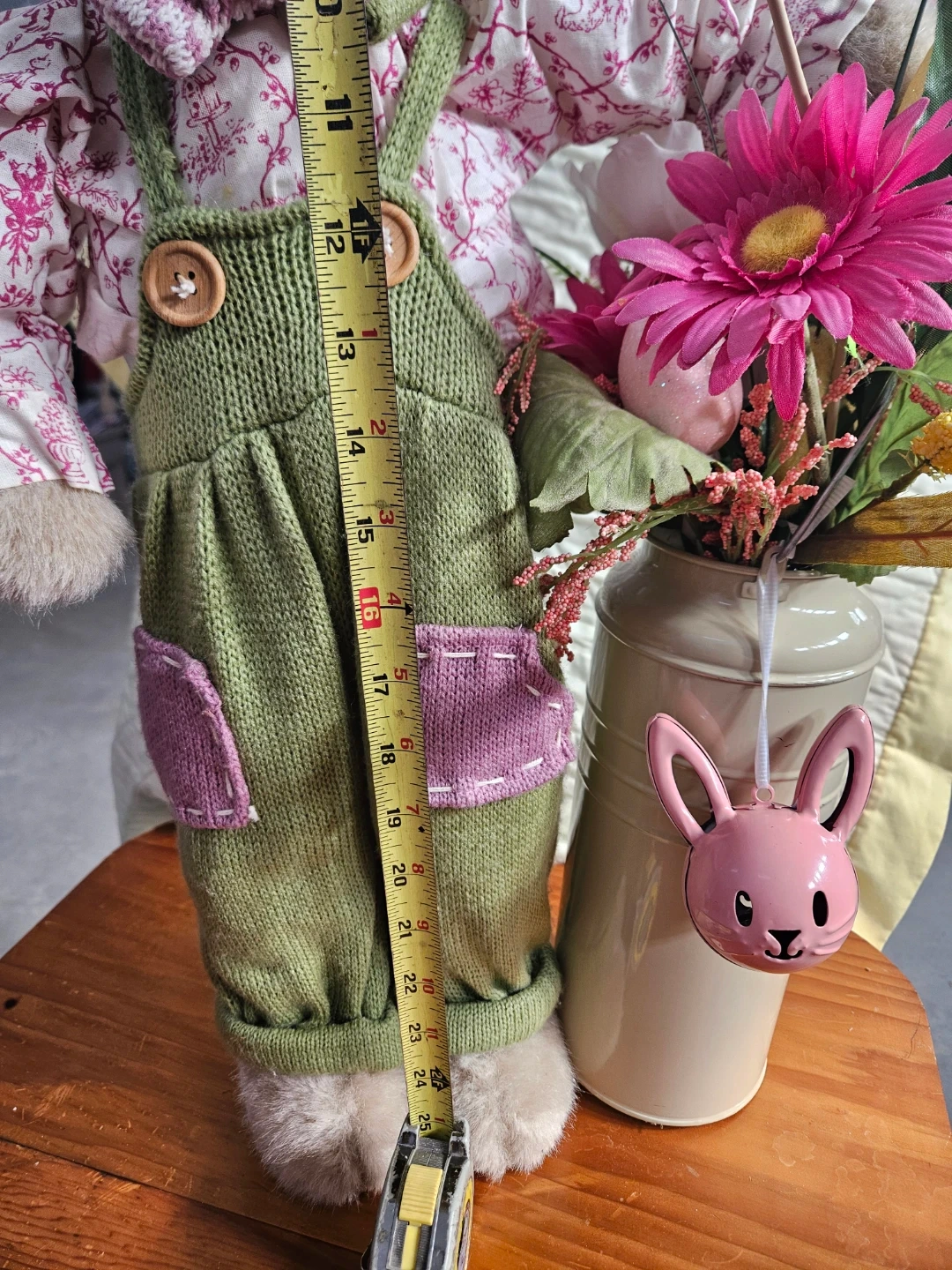 This adorable Easter bunny figurine stands tall with a bouquet of colourful faux flowers. It's dressed in a cute floral shirt and green overalls, complete with a pink bunny ornament hanging from its vase. A lovely spring decoration!