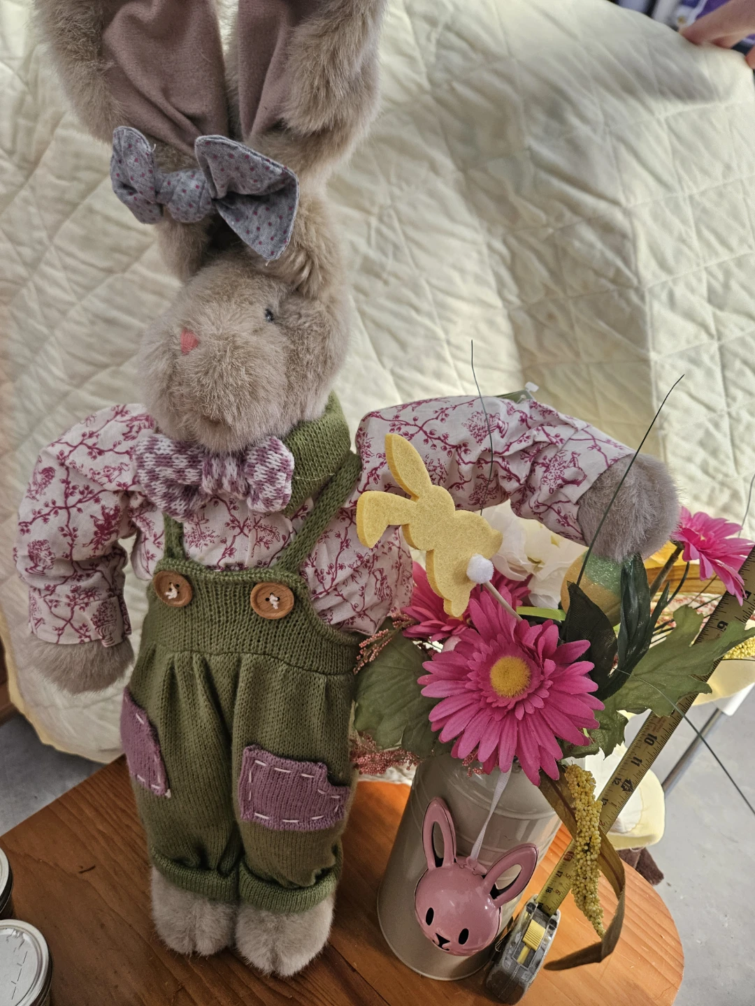 This adorable Easter bunny figurine stands tall with a bouquet of colourful faux flowers. It's dressed in a cute floral shirt and green overalls, complete with a pink bunny ornament hanging from its vase. A lovely spring decoration!