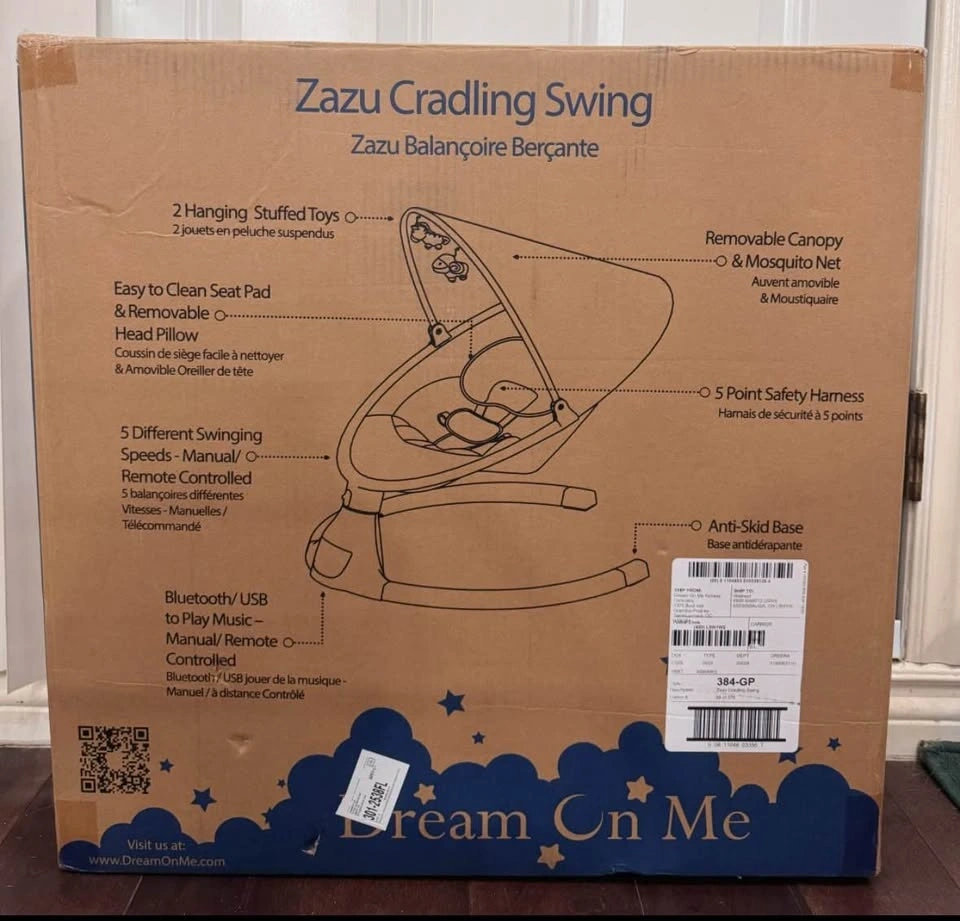 Excellent condition! Gently used for 1.5 months because my baby prefers a traditional hammock. Features: 5 swing speeds with remote control, Bluetooth + USB music options, 5-point safety harness, removable pillow, canopy & mosquito net. Includes 2 soft plush toys. Compact, modern design with anti-skid base. Easy to clean seat pad. Timer settings (8 / 15 / 30 mins). Multi-award winner. Perfect for babies from newborn to 6 months. Dimensions: 25”L × 21.5”W × 19.5”H. Weight: 7.3 lbs. Let me know if you're interested!