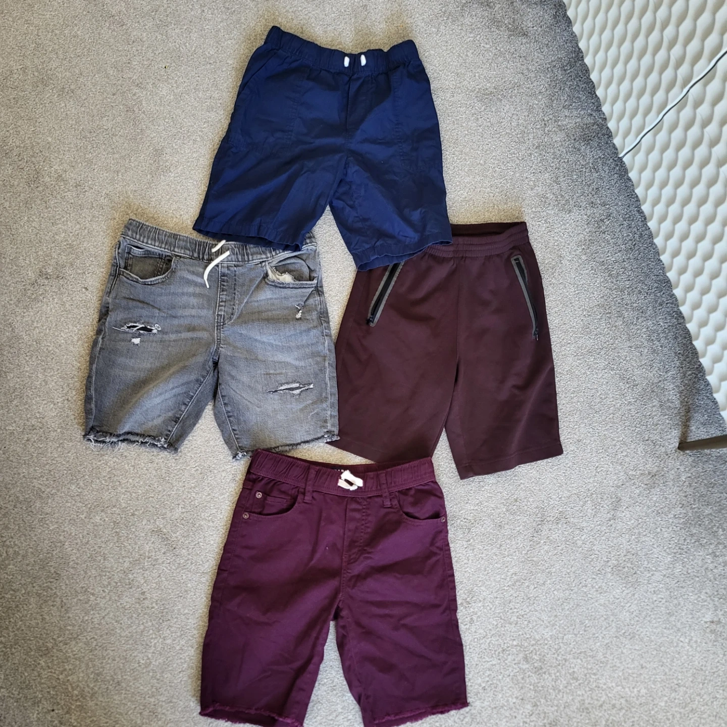 Lot of four boys' shorts including two pairs of burgundy, one pair of grey denim with distressing, and one pair of navy blue. Elastic waistbands with drawstrings are on all pairs. Ready for summer fun!