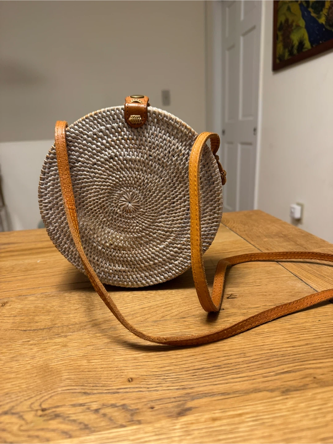 This round straw bag features a woven design with a natural rattan finish. It has a tan leather strap and a small leather tab closure. It's a stylish accessory for casual outings! Originally made in Bali.