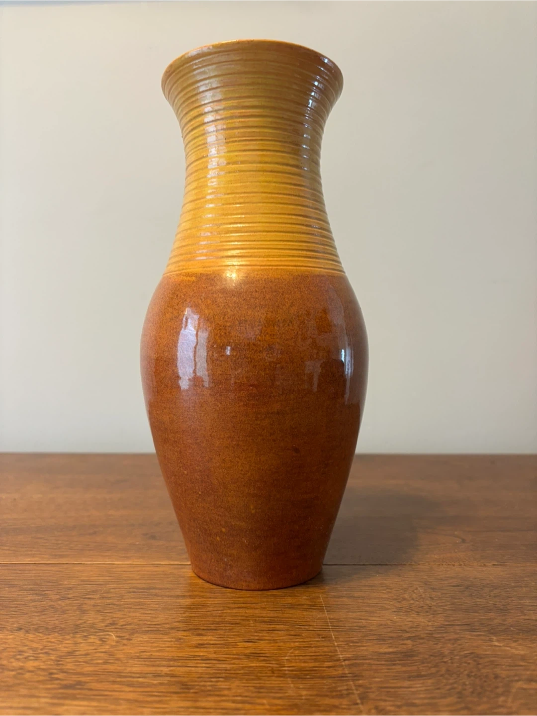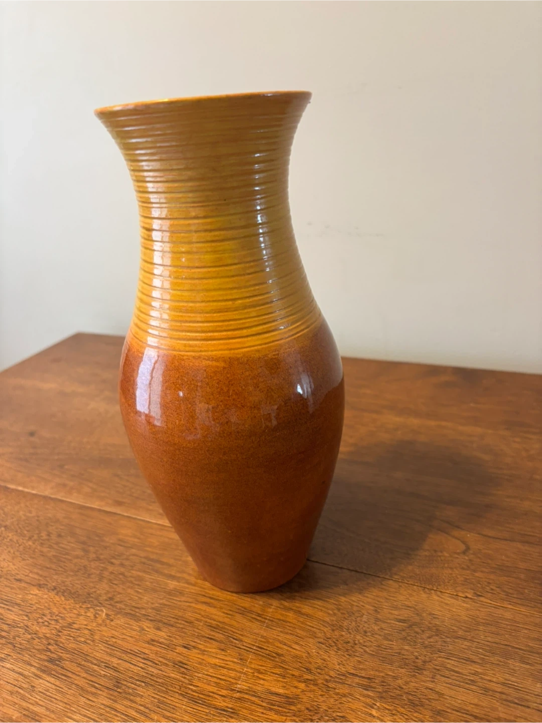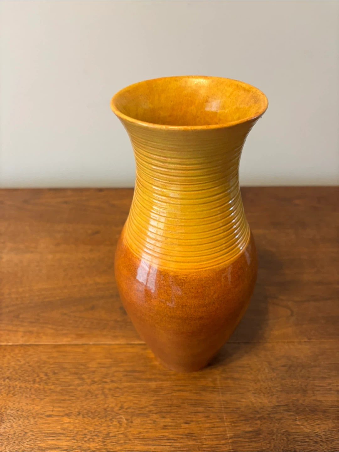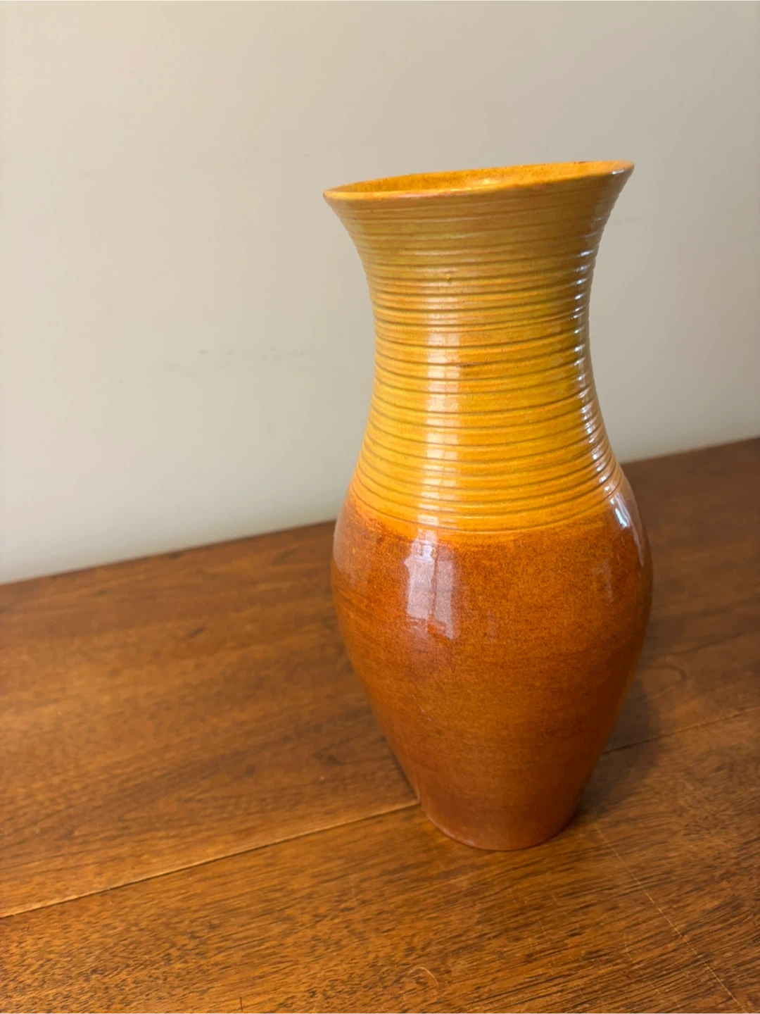 A beautiful vase with a glossy, ombre glaze. It features a ribbed texture around the neck and a smooth, bulbous body. This vase is perfect for displaying fresh flowers or as a standalone decorative piece. 11” tall. Cash only.