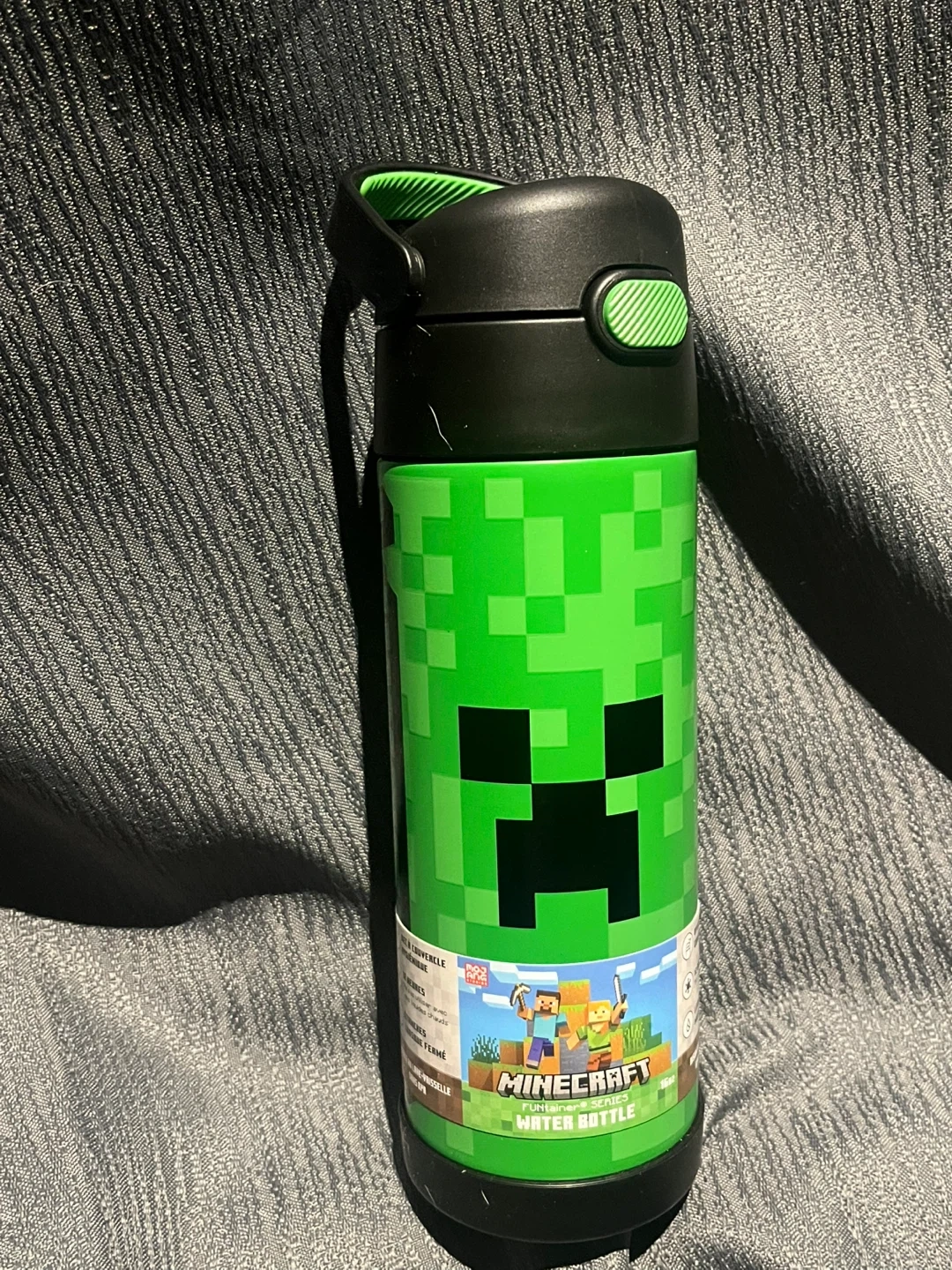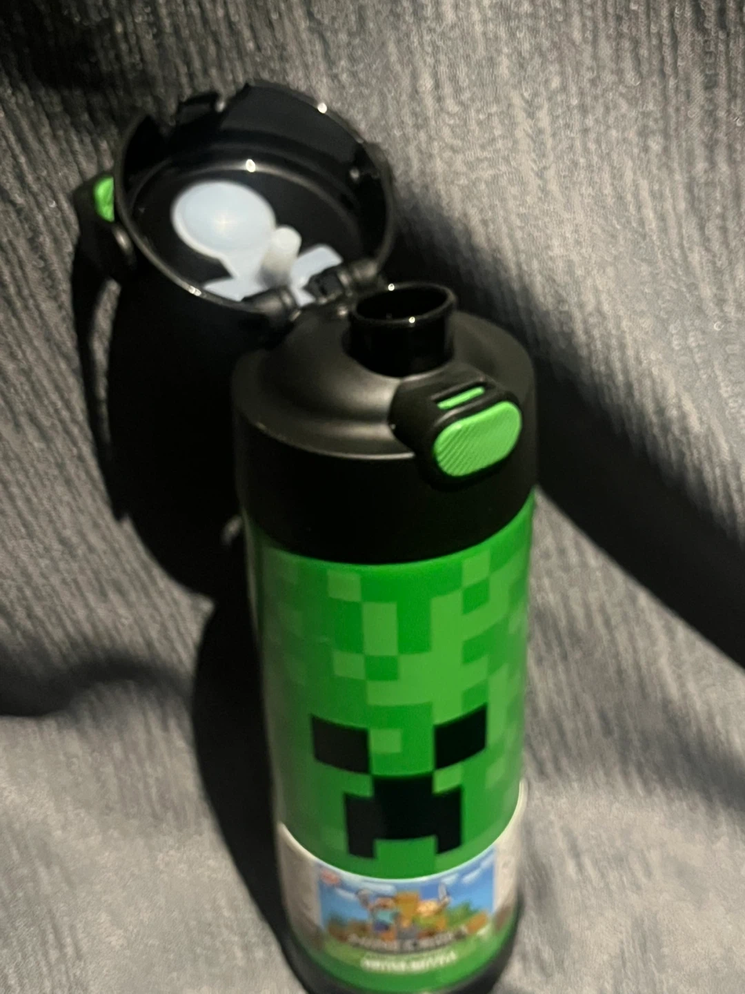 This is a Minecraft-themed water bottle featuring a Creeper design. It's suitable for kids. The bottle has a flip-top lid for easy drinking.