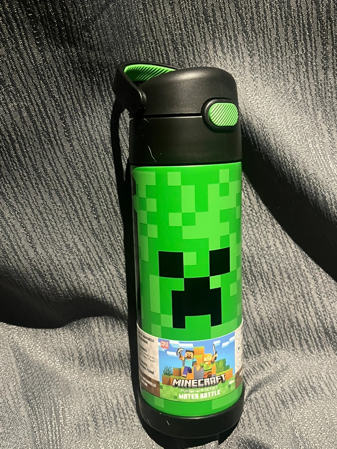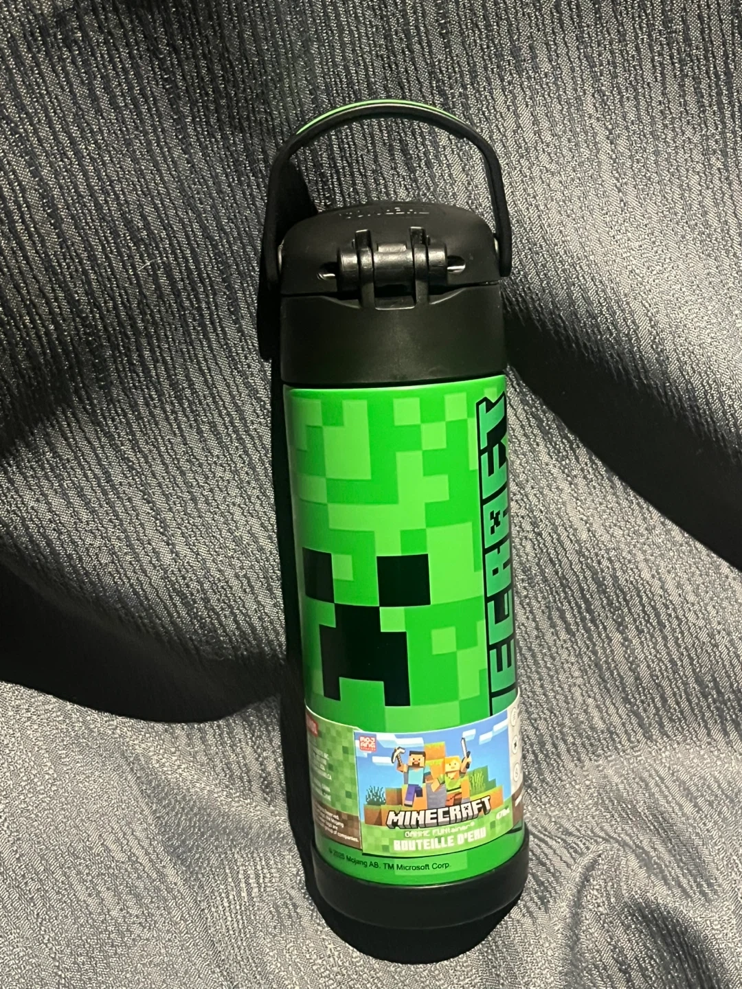 This is a Minecraft-themed water bottle featuring a Creeper design. It's suitable for kids. The bottle has a flip-top lid for easy drinking.
