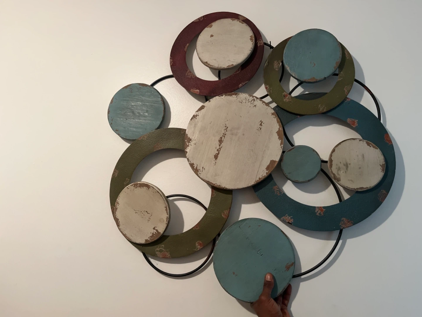 This is a decorative wall art piece featuring a cluster of overlapping circles in various sizes and distressed colours like cream, muted green, teal, and burgundy. It's made of metal with a rustic, shabby chic finish. Its abstract design adds visual interest to any room.