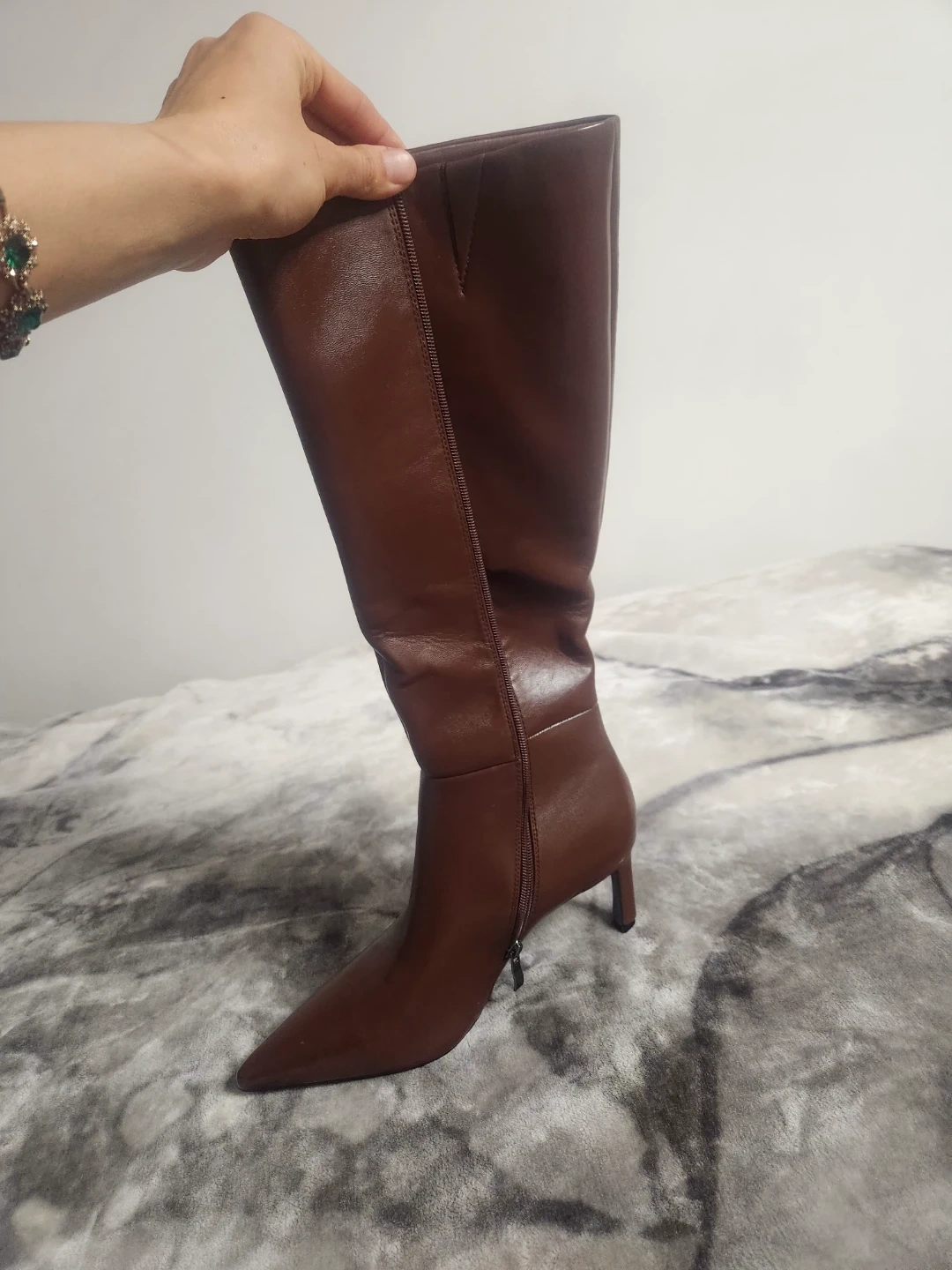 These are a pair of stylish brown knee-high boots with a pointed toe and a slim heel. They feature a zipper closure on the side for easy wear. Perfect for adding a touch of elegance to any outfit!