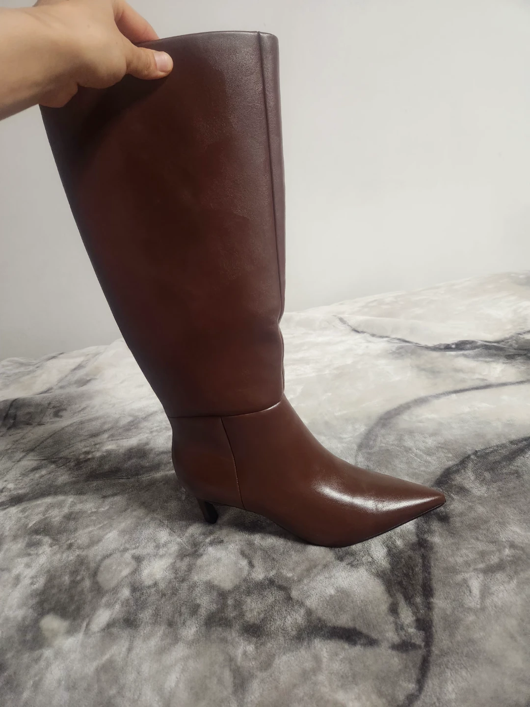These are a pair of stylish brown knee-high boots with a pointed toe and a slim heel. They feature a zipper closure on the side for easy wear. Perfect for adding a touch of elegance to any outfit!