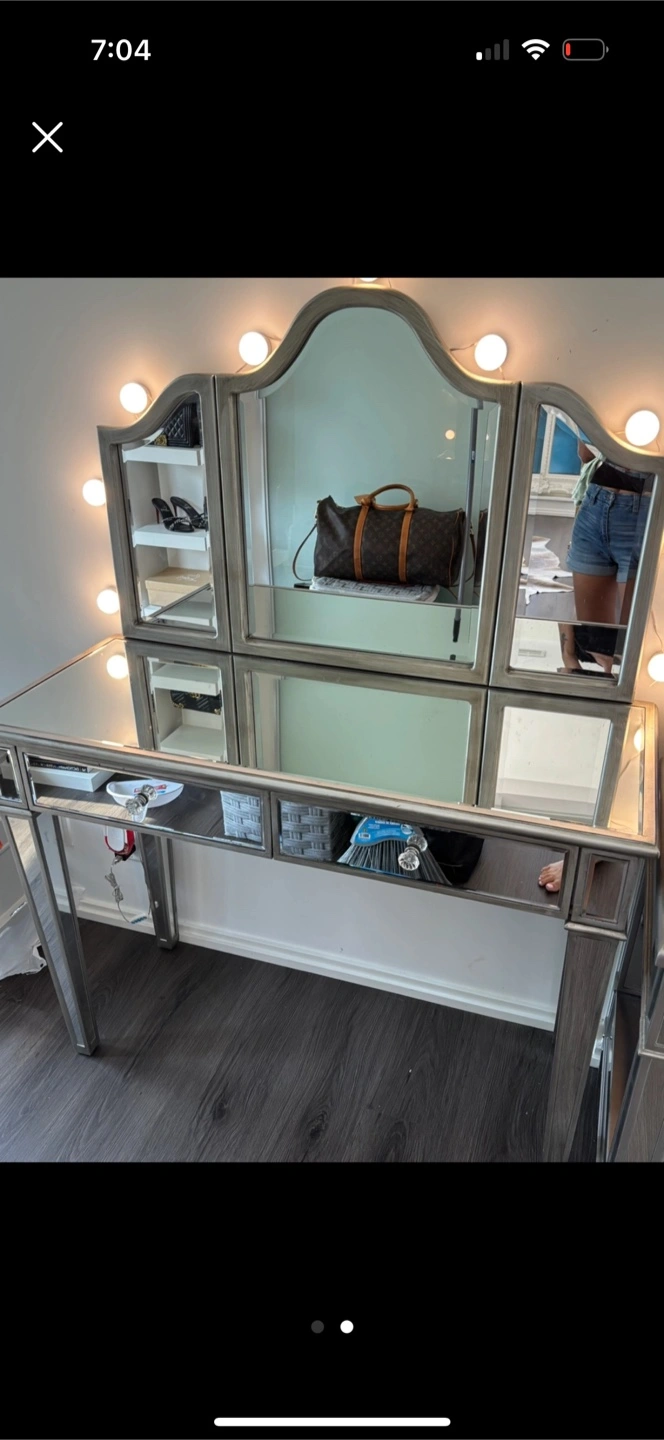Selling a mirrored vanity makeup table with lights. It's in great condition and would be perfect for a bedroom or dressing room! It has a drawer for storage and lights around the mirror for applying makeup, gorgeous design.