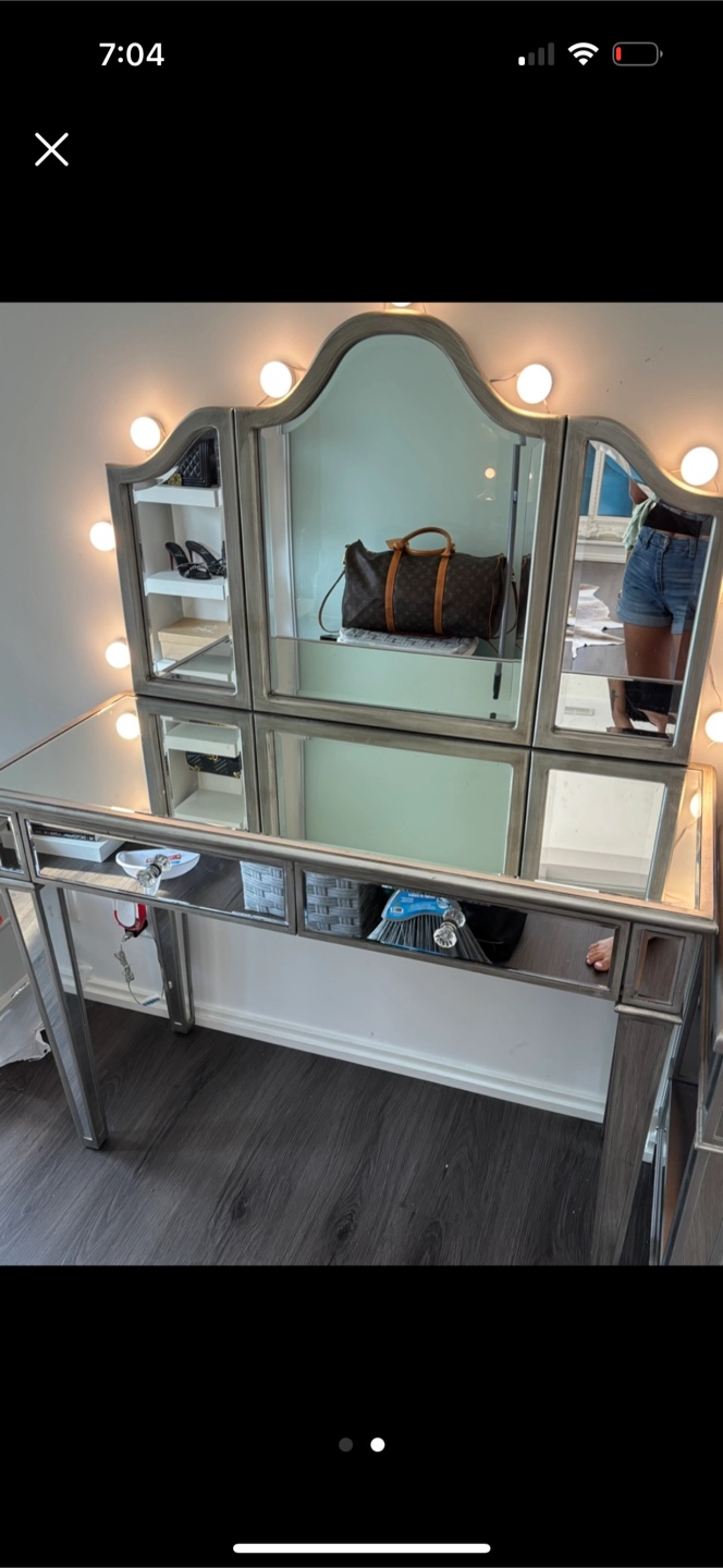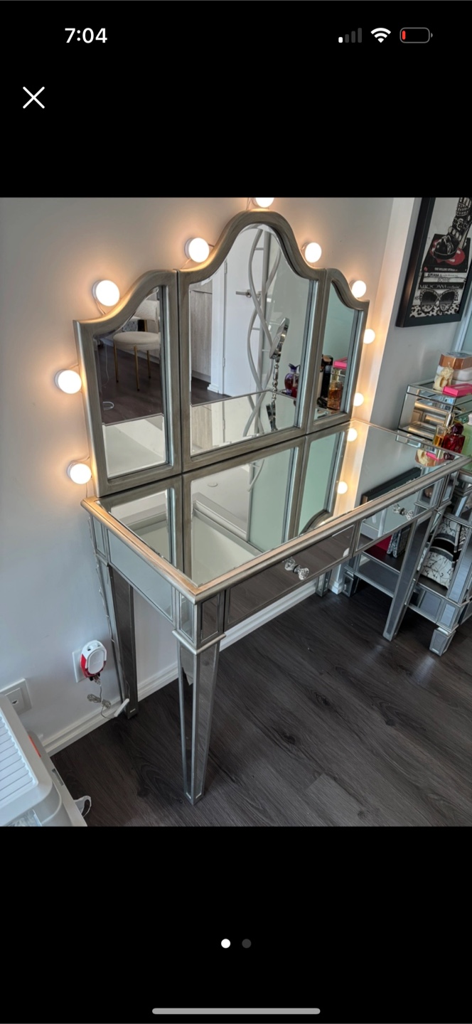 Selling a mirrored vanity makeup table with lights. It's in great condition and would be perfect for a bedroom or dressing room! It has a drawer for storage and lights around the mirror for applying makeup, gorgeous design.