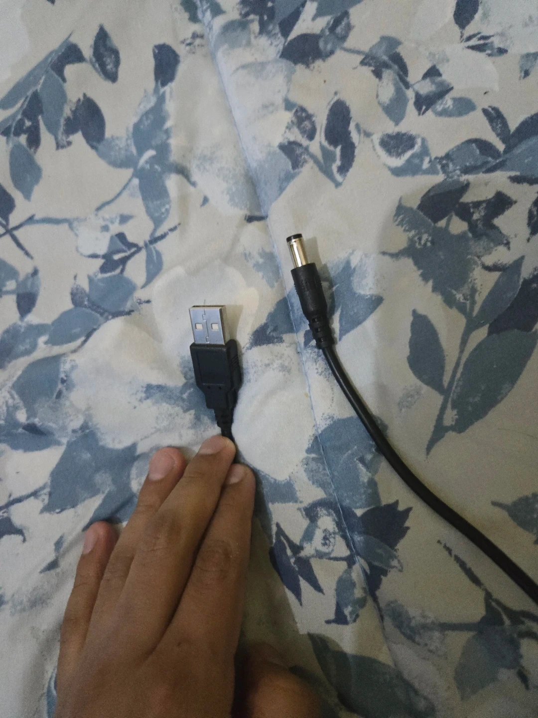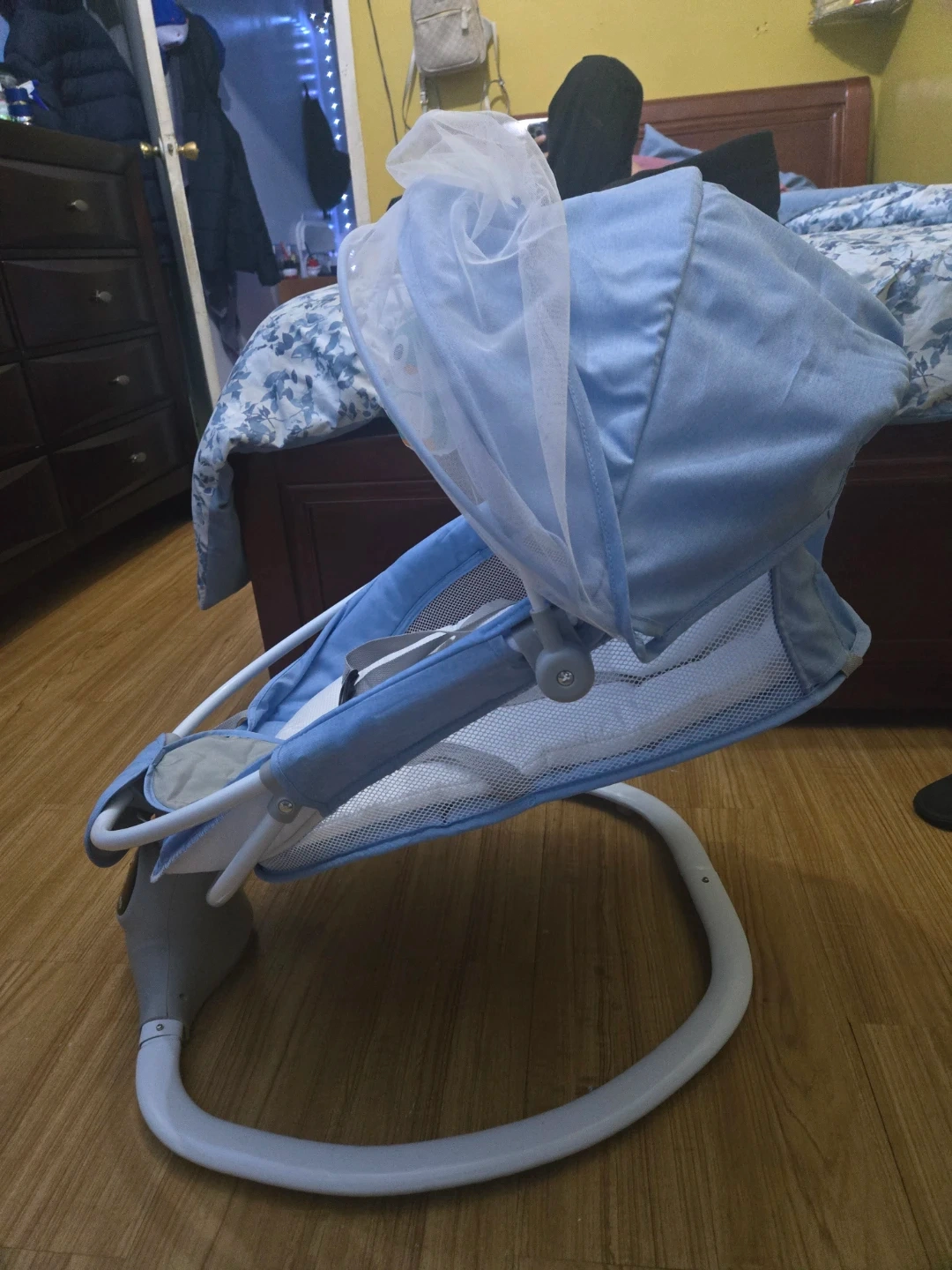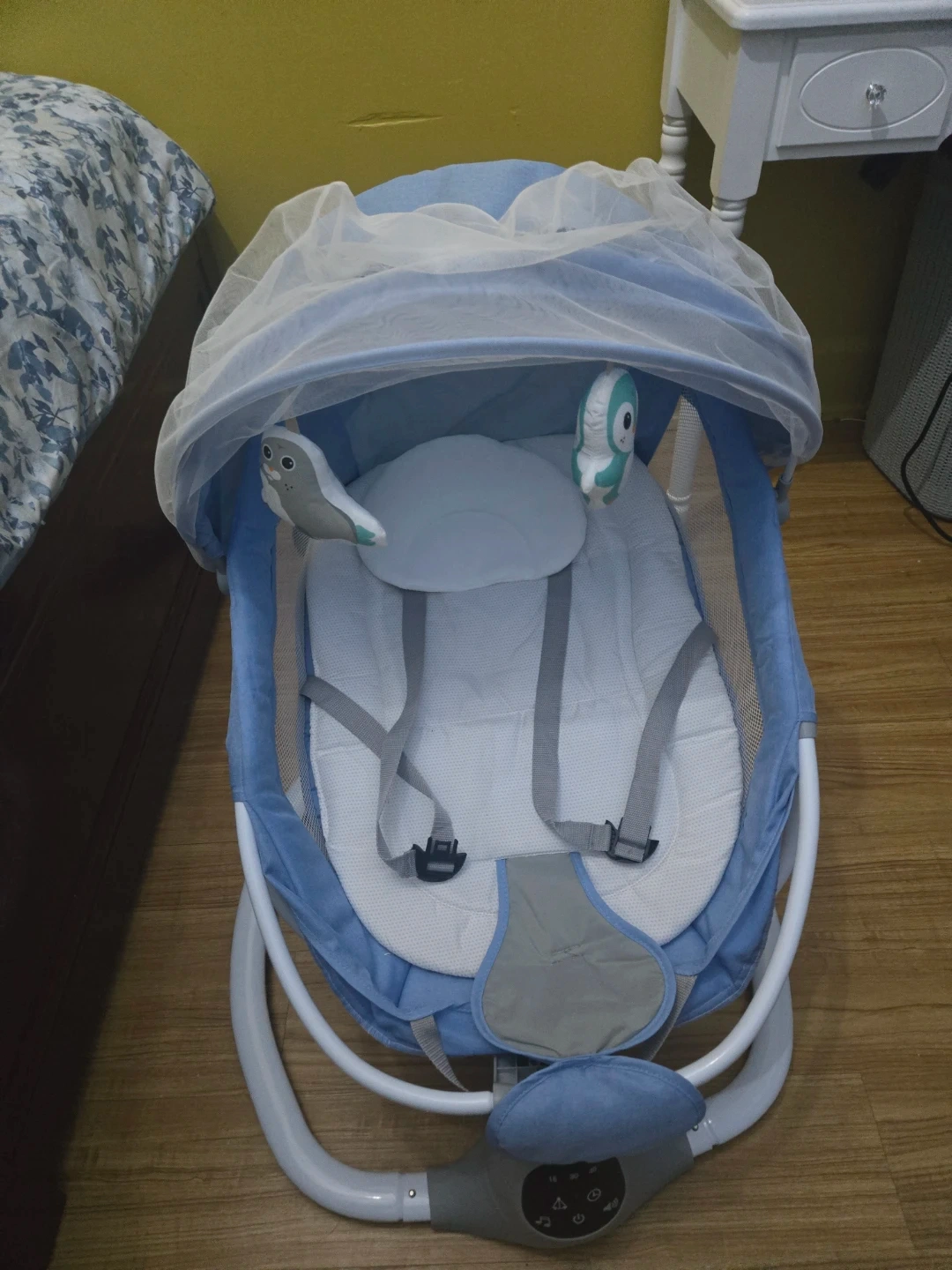 This is a blue baby swing with a canopy and hanging toys. It comes with a USB power cable. The swing has adjustable straps for safety. It's great for keeping babies entertained and soothed.
