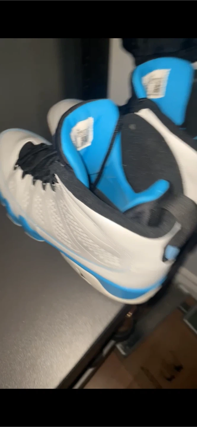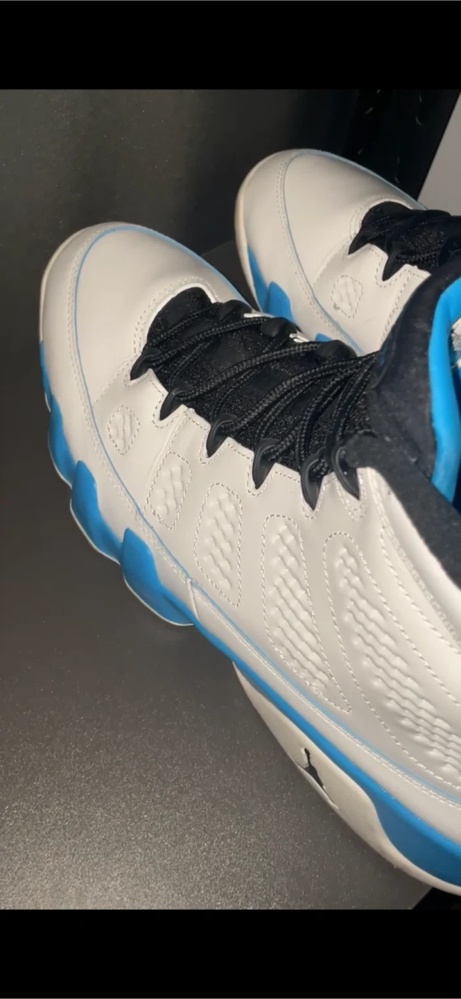 White and light blue Jordan Air 9 sneakers. These shoes feature a leather and synthetic upper with a rubber sole.