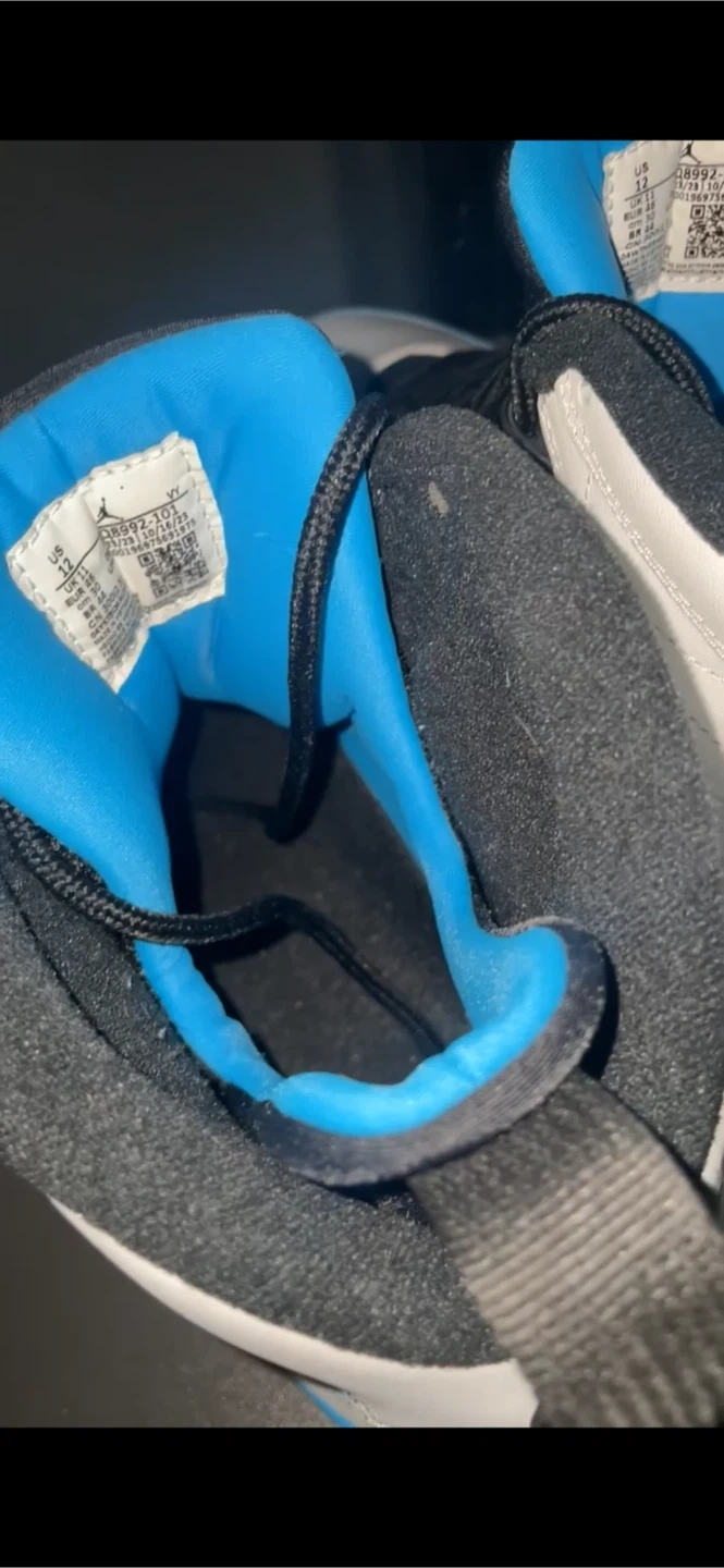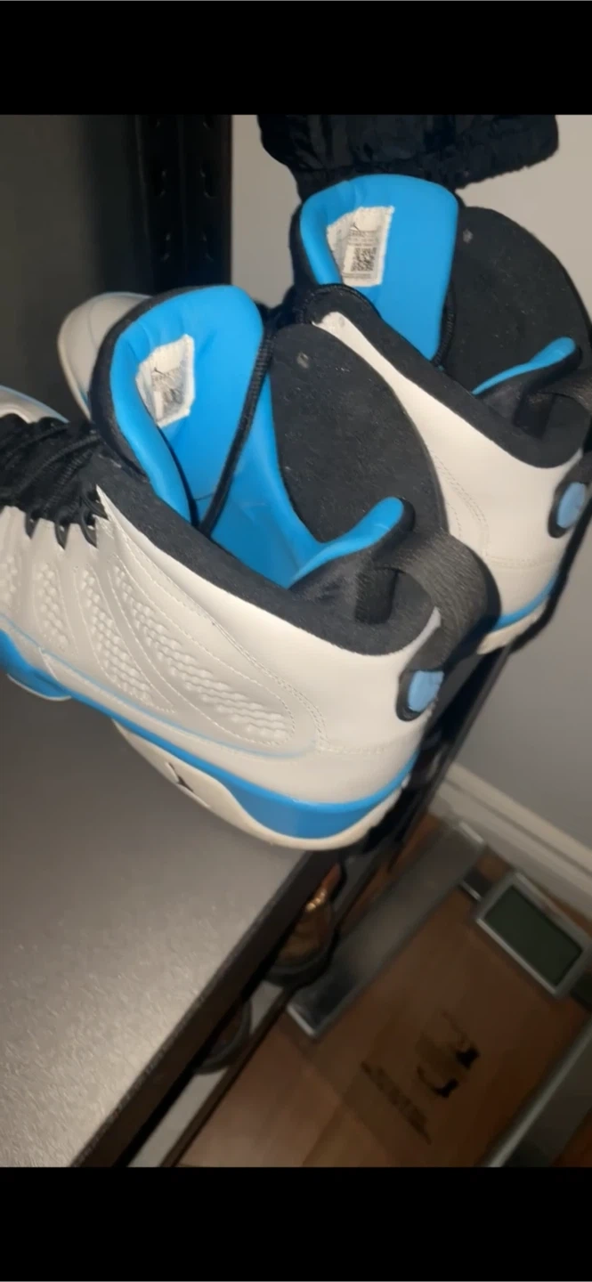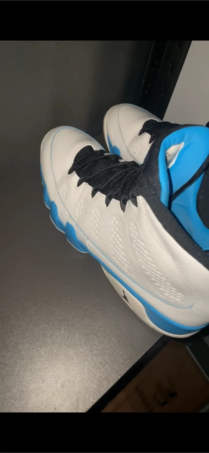 White and light blue Jordan Air 9 sneakers. These shoes feature a leather and synthetic upper with a rubber sole.