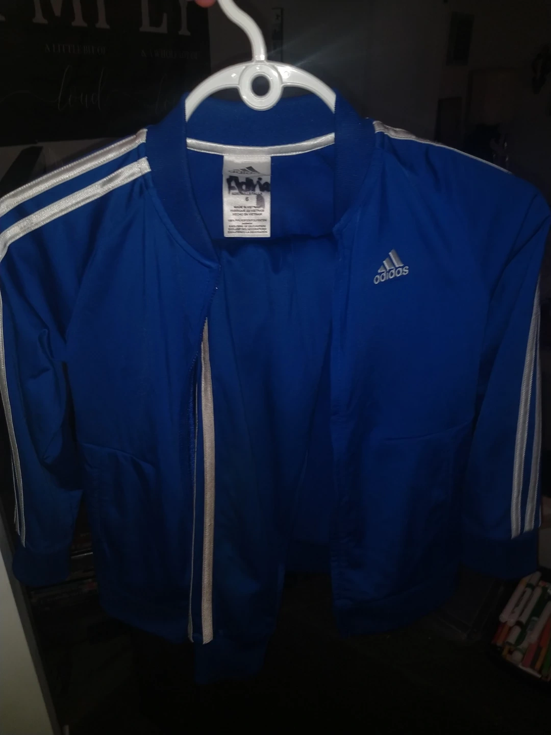 This is a childrens blue Adidas track jacket with white stripes on the sleeves. It's a full-zip style. Classic athletic wear!