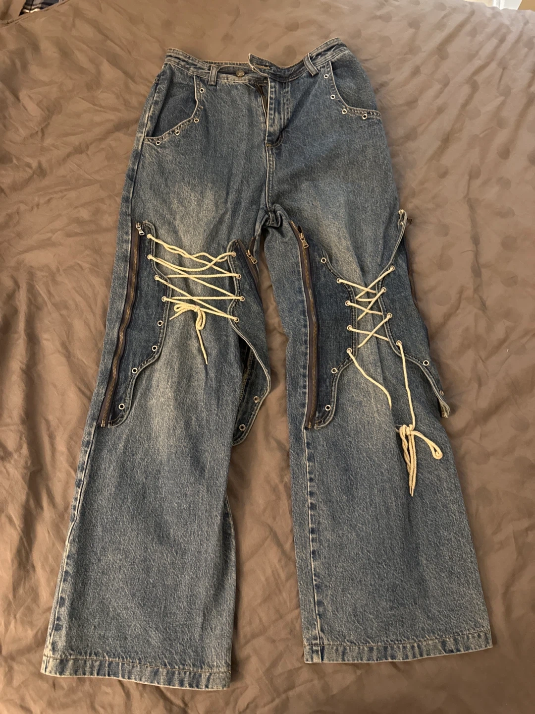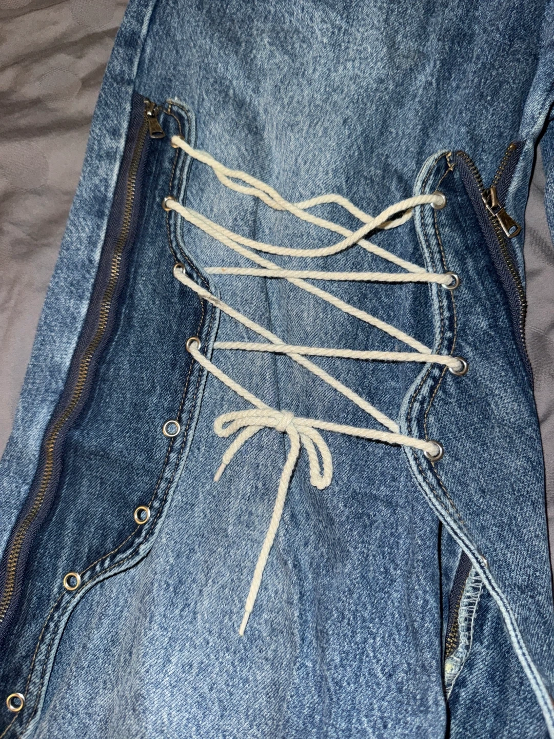 These 24ans denim jeans feature a unique lace-up detailing on the back and zippers down the legs (detachable). Made from classic blue denim. Great for a bold fashion statement!