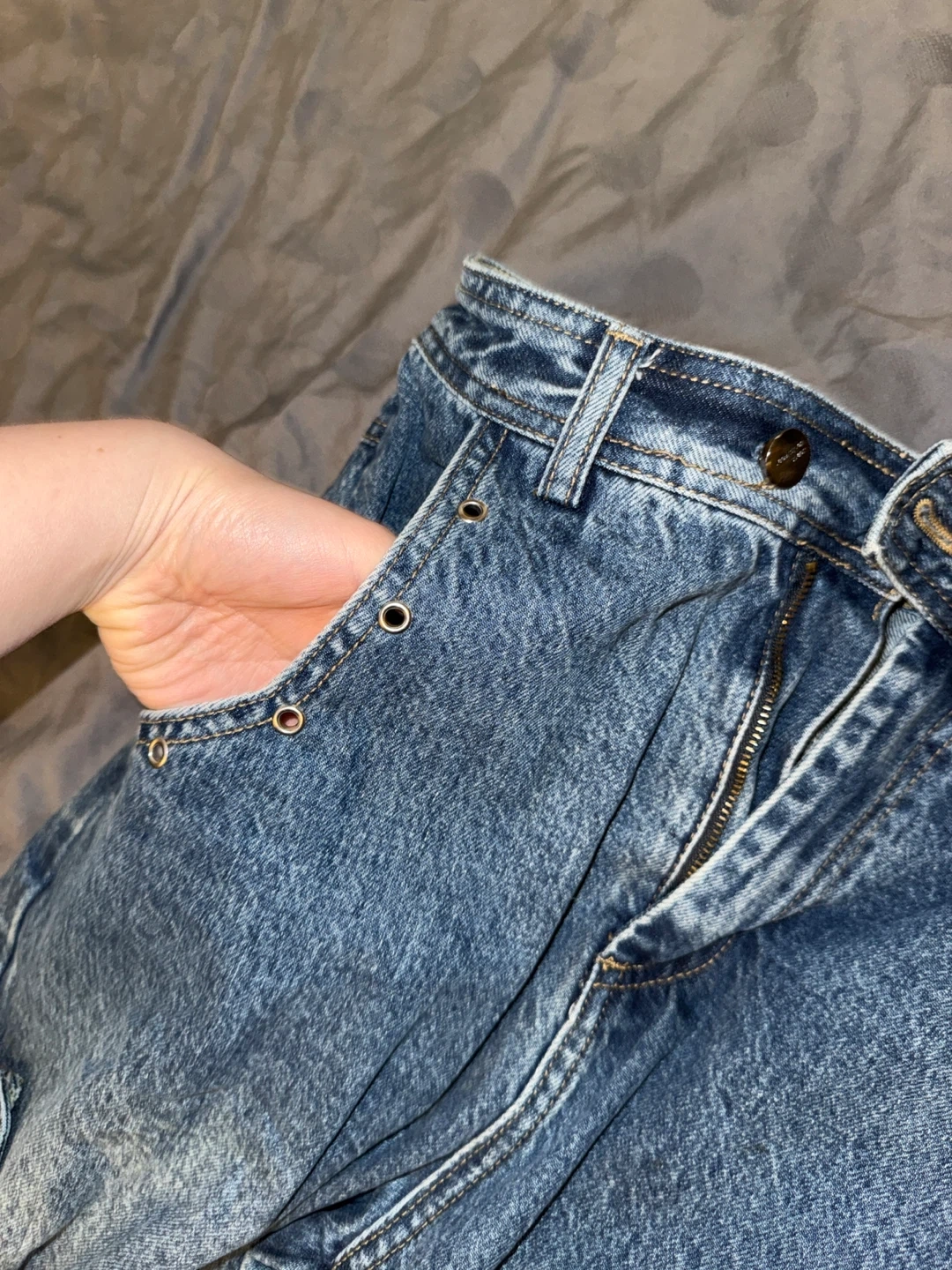 Waist around 70-74cm hip around 100cm Baggy style