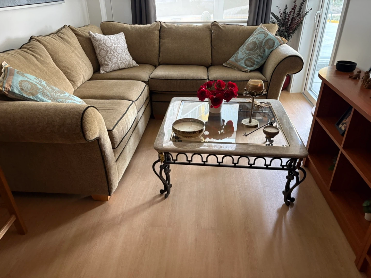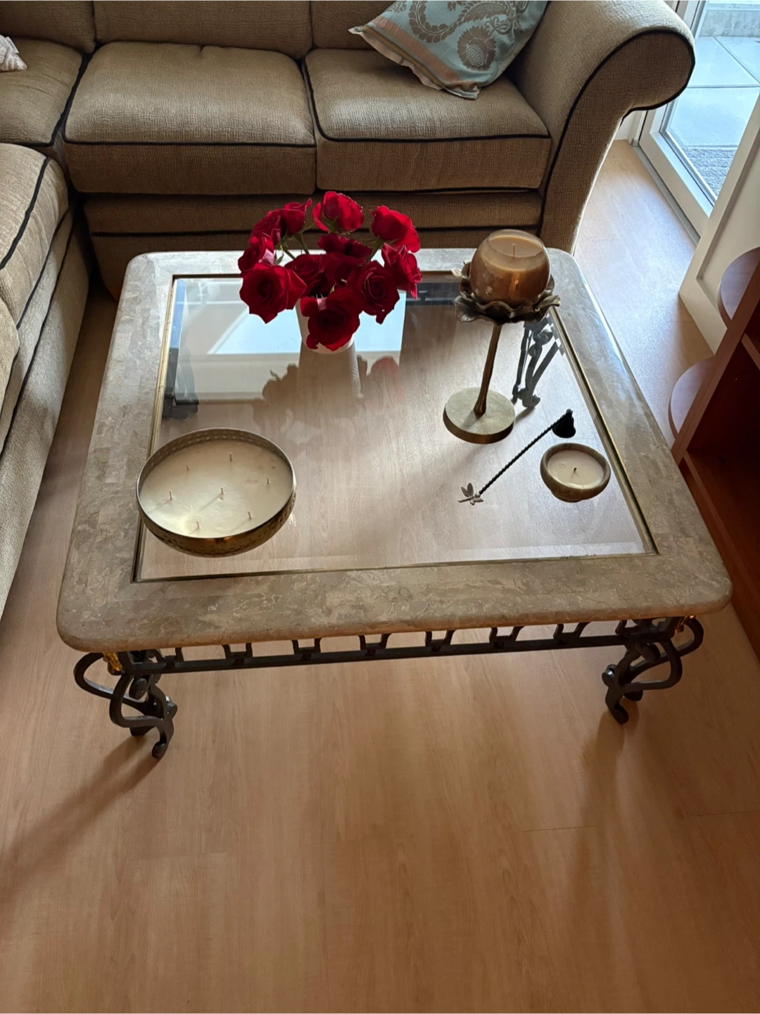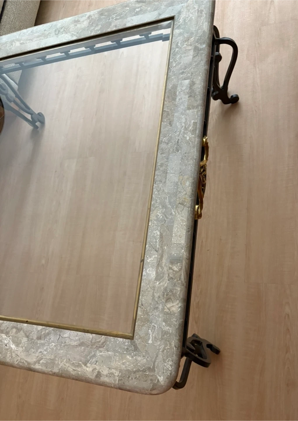Stylish square coffee table featuring a clear glass top with a decorative marble-look inlay border. It's supported by an ornate black metal base with scrolled legs. This table's unique design makes it a great accent piece for any living room. Just moved to small apartment and don't fit in my living room 😏.