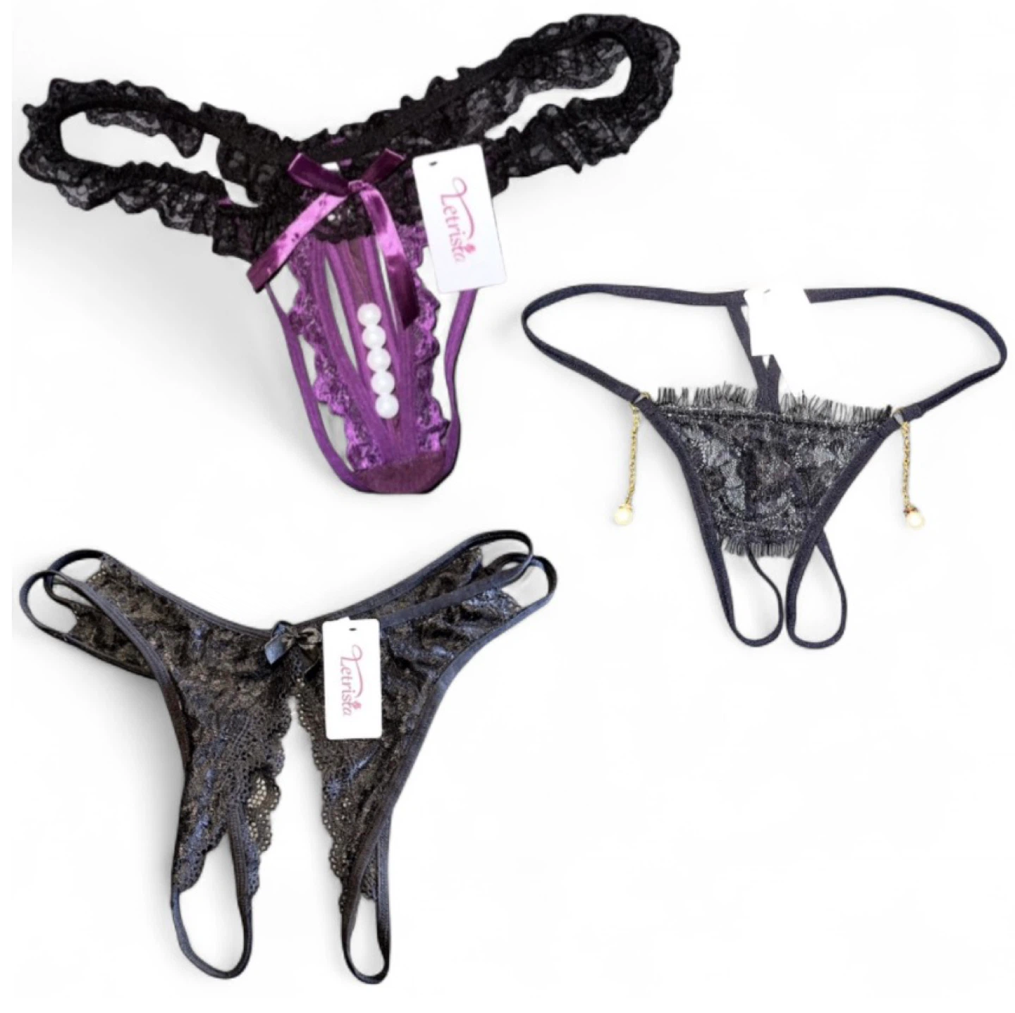 NEW Cream Ivory Black Lace Satin Silk Thong Panties