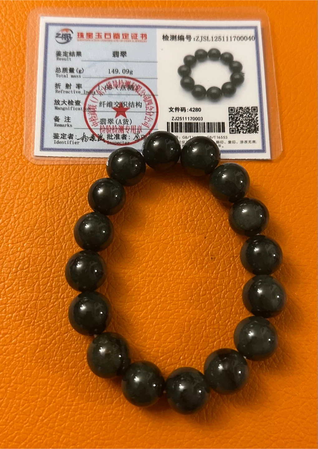 • Certificate: The image includes a identification certificate detailing the jade's properties. ®