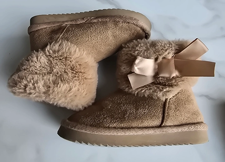 Lovely, soft tan-colored boots. They have a fluffy interior trim and a bow detail on the back. These are the perfect choice for those chilly days, bringing comfort and style.