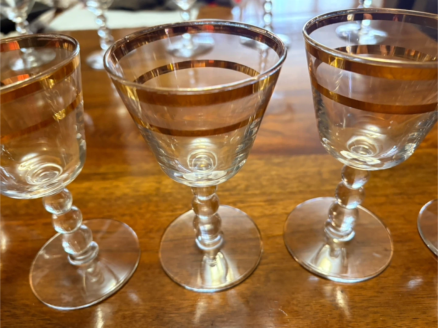 This is a set of vintage wine glasses with a delicate gold rim and a unique beaded stem. They're perfect for serving wine or cocktails at special occasions. Glass material.