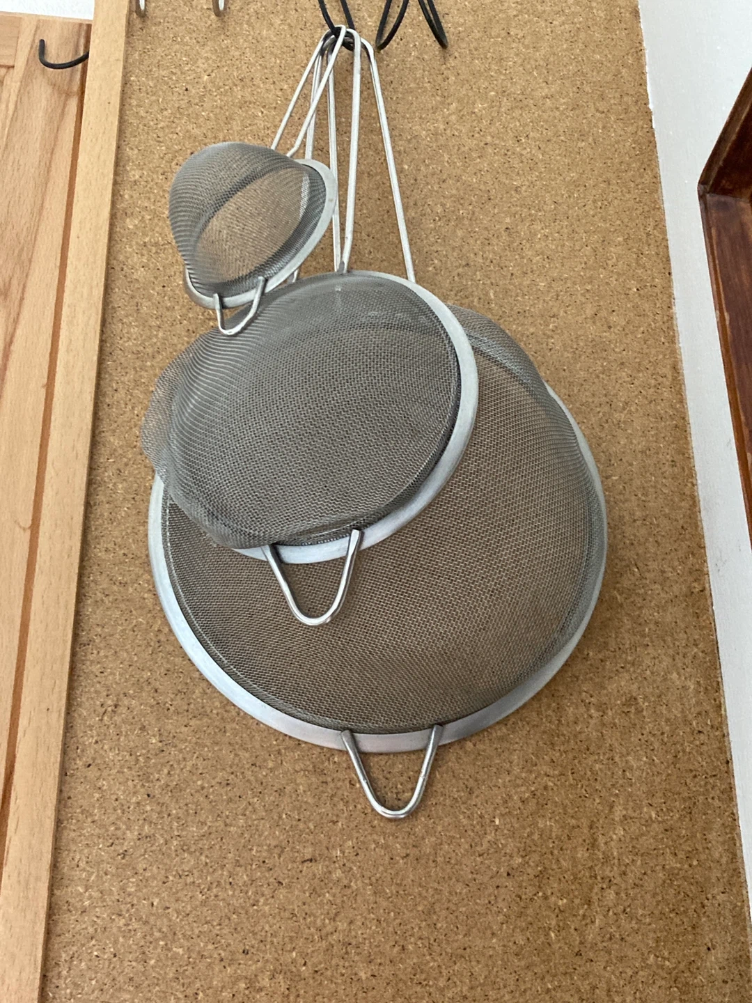 This is a set of three mesh strainers. They're made of metal with fine mesh. Includes different sizes for various kitchen tasks! One is slightly broken on edge
