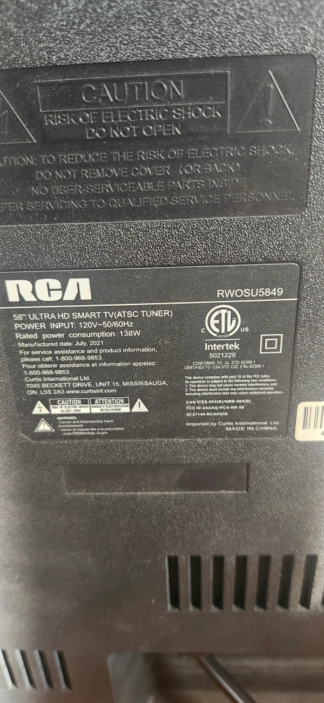 Selling a RCA 58" Ultra HD Smart TV. Model: RWOSU5849 It has HDMI and USB ports for connecting your devices. The manufacturing date is July 2023