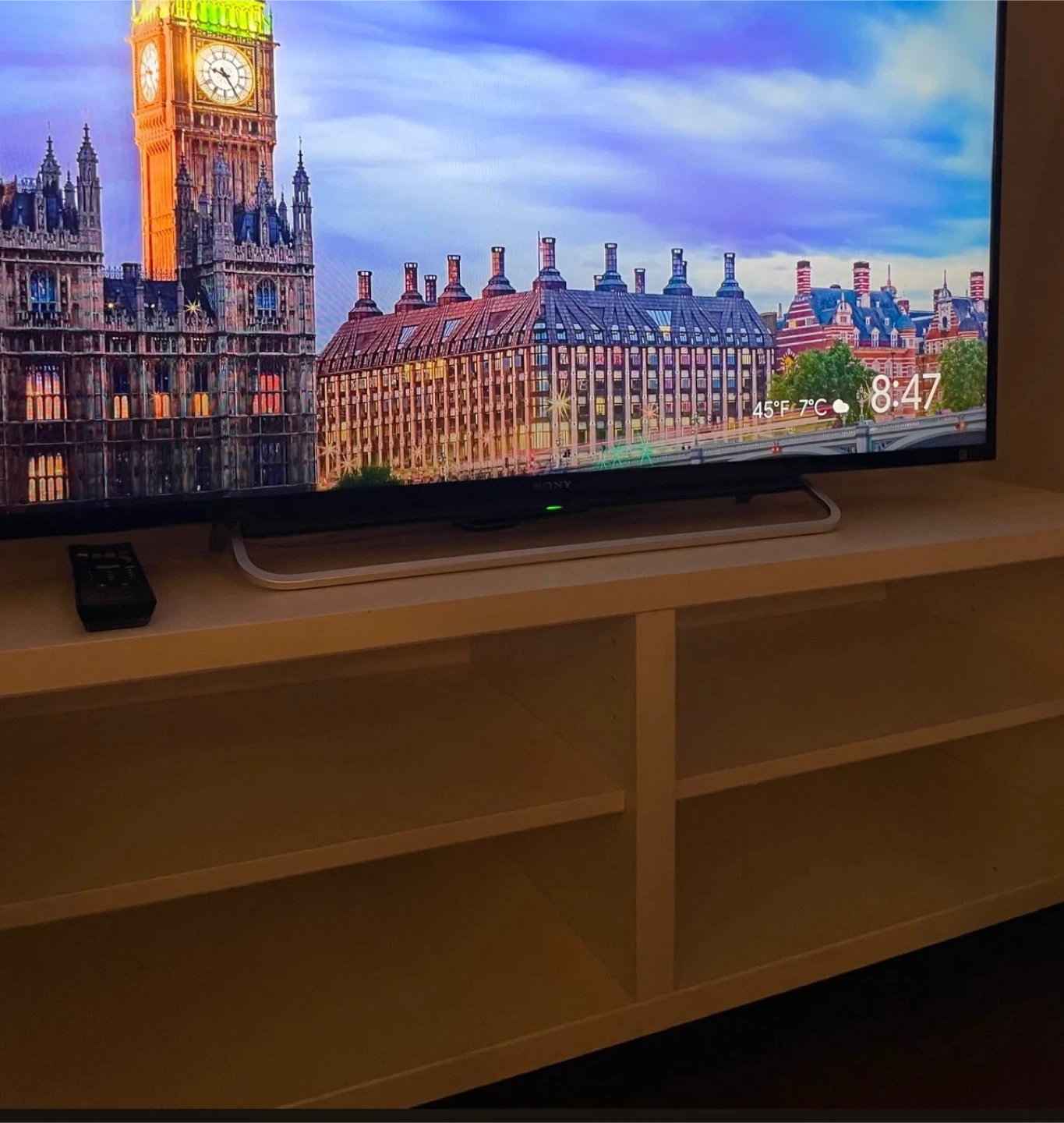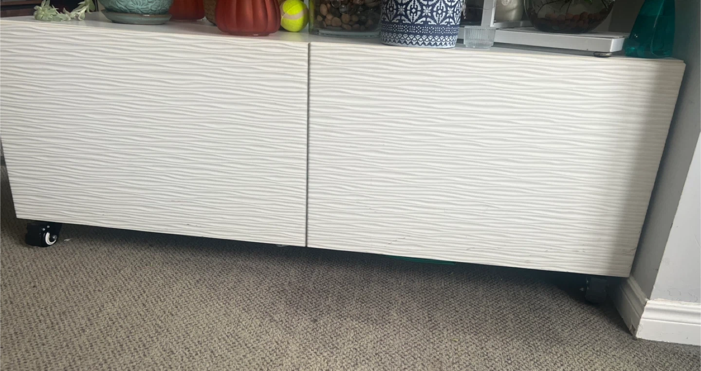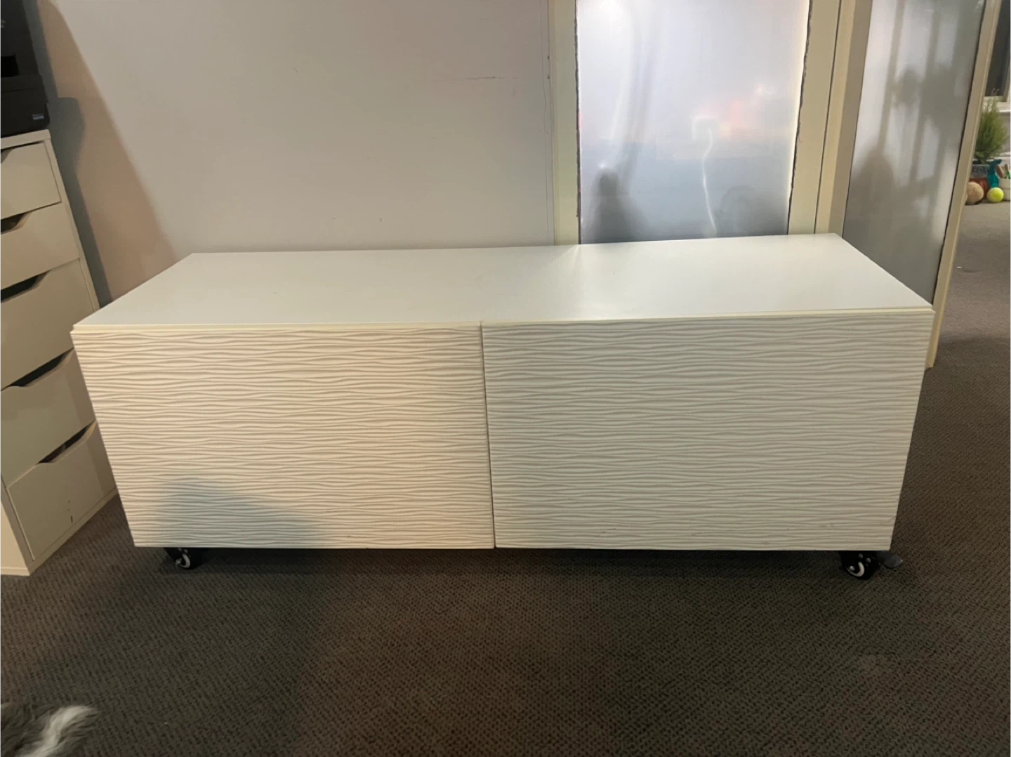 This unit features a modern textured front and casters for easy mobility. It has two cabinet doors for storage. Its clean design suits various living spaces.