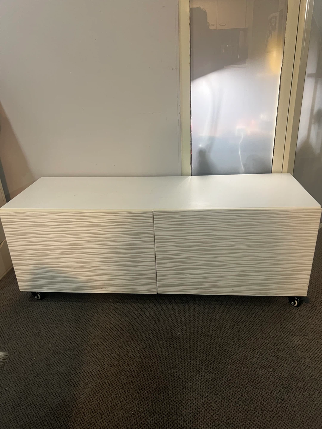 This unit features a modern textured front and casters for easy mobility. It has two cabinet doors for storage. Its clean design suits various living spaces.
