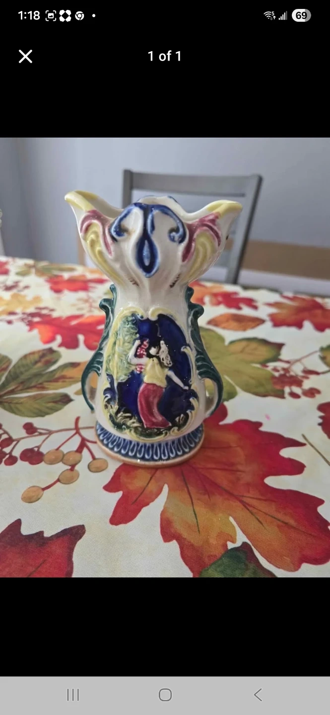 This vintage ceramic vase features a colourful scene with two figures. It's a decorative piece with a unique design. Made from ceramic material.