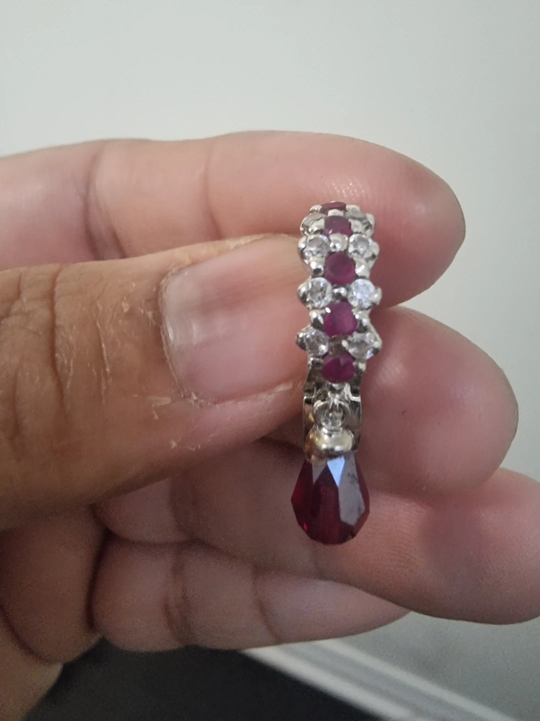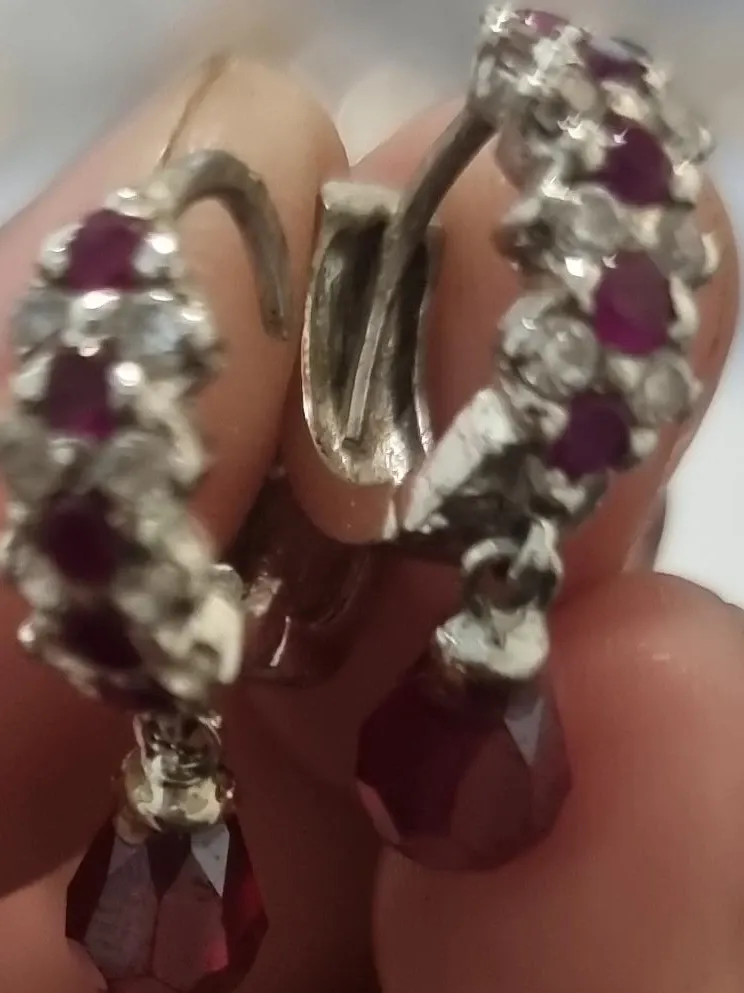 These hoop earrings feature a cluster of sparkling crystals and deep red stones. A faceted ruby-red bead dangles from each earring. They're designed with a secure clasp for comfortable wear.