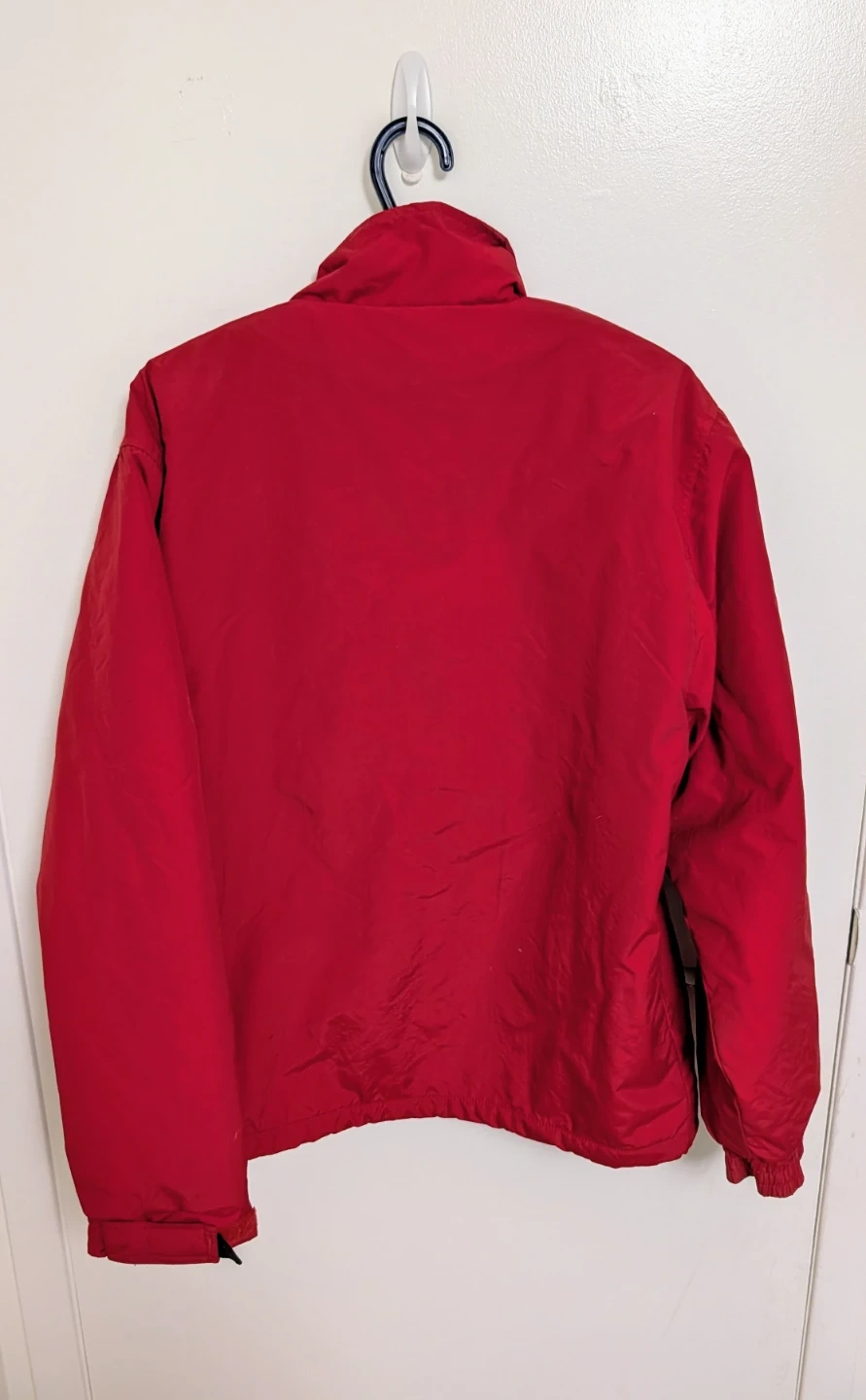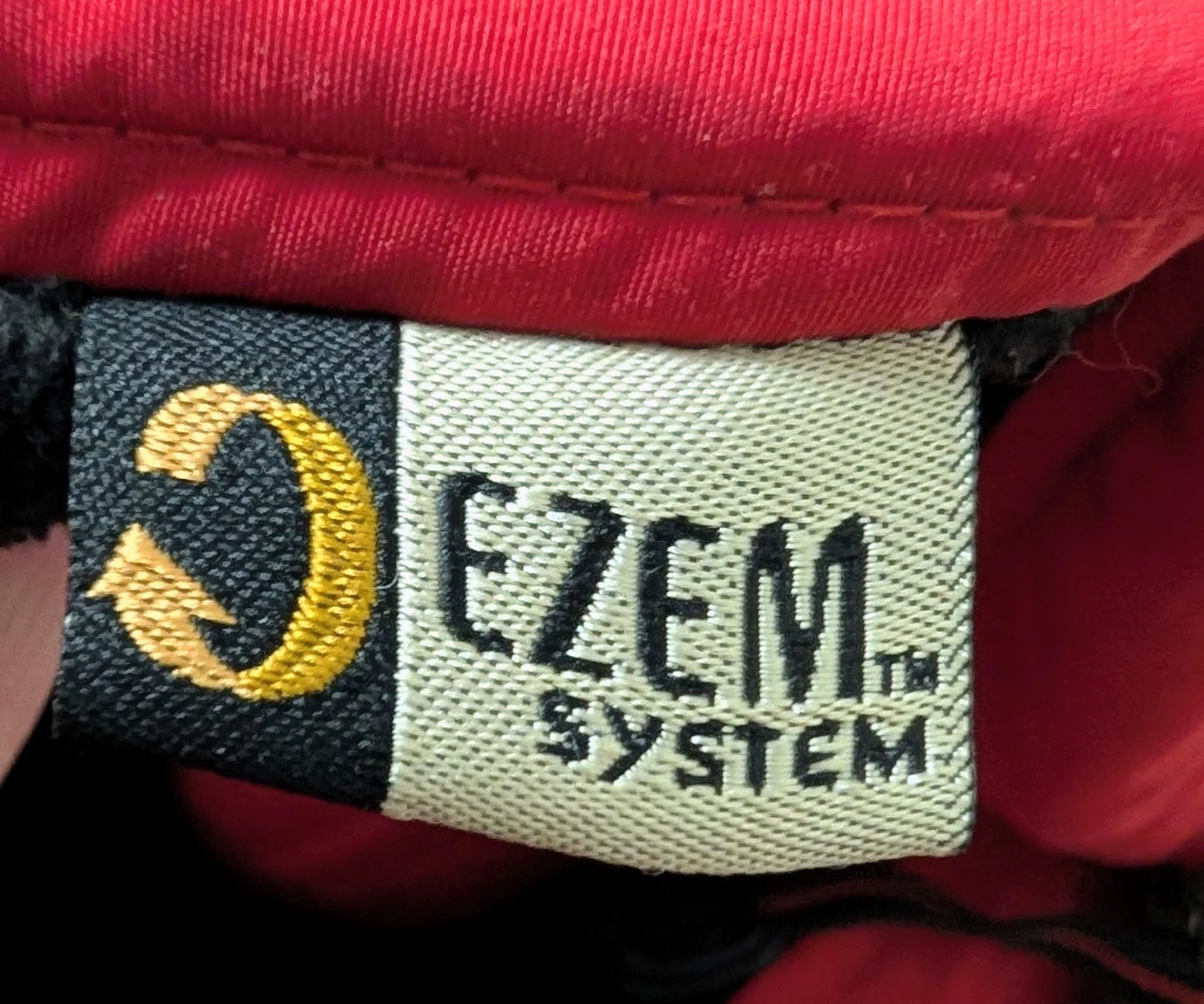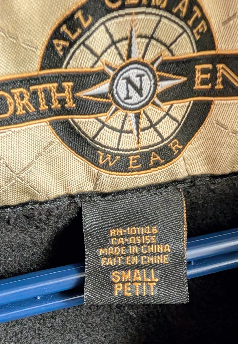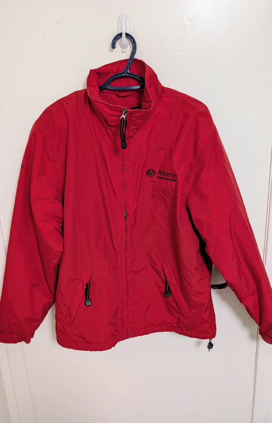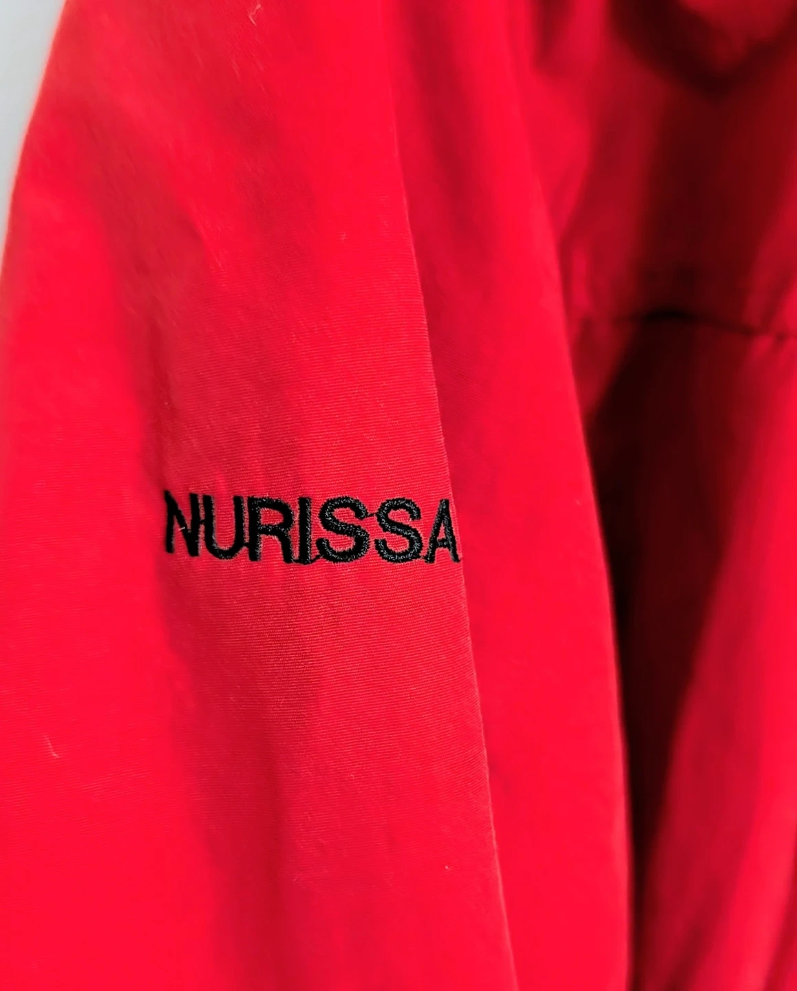 This is a red jacket from North End Wear. It's a size small. It features the "EzeM System" and the name "Nurissa" embroidered on the sleeve and Assante on front left chest.