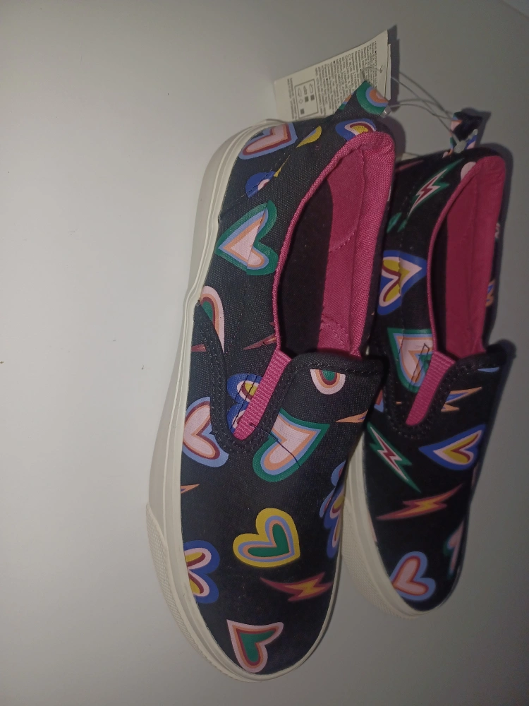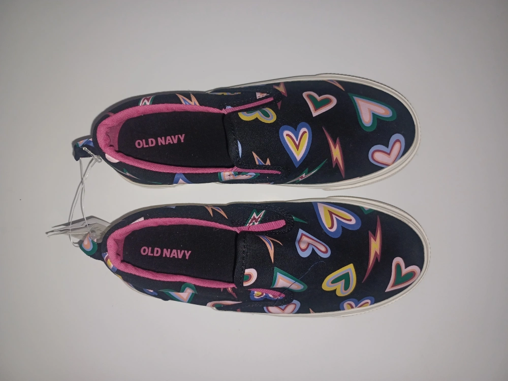 These Old Navy slip-on sneakers are perfect for your little one! They feature a fun heart and lightning bolt pattern on a black background with a pink interior. Size 2y and brand new.