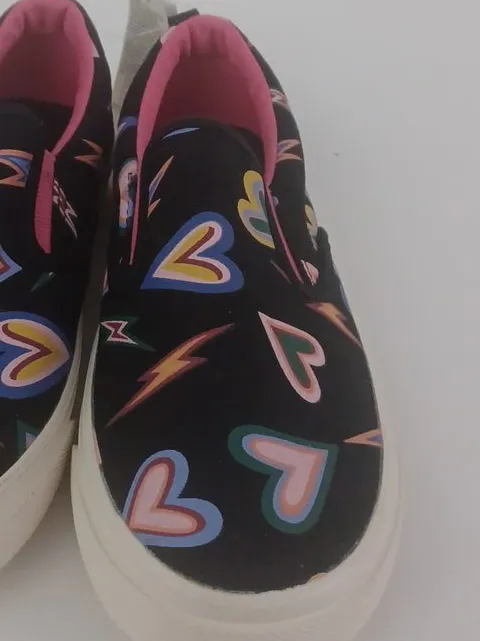 These Old Navy slip-on sneakers are perfect for your little one! They feature a fun heart and lightning bolt pattern on a black background with a pink interior. Size 2y and brand new.