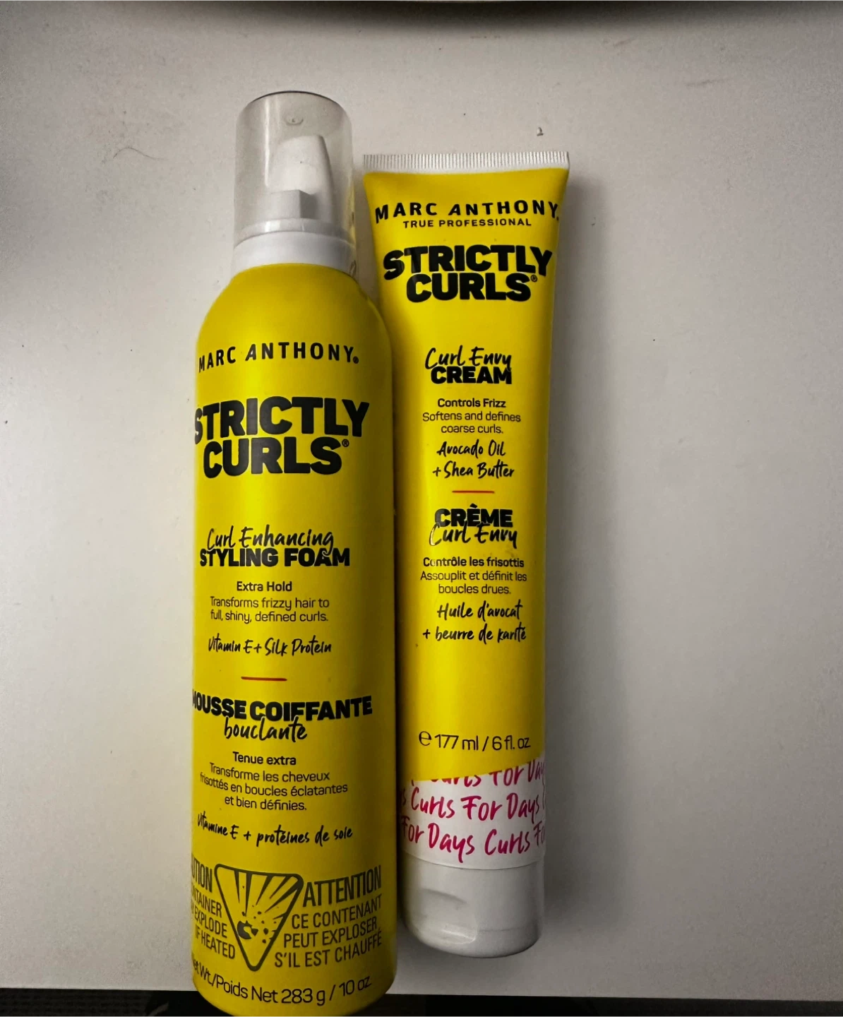 This set includes Marc Anthony Strictly Curls Curl Enhancing Styling Foam and Curl Envy Cream. The foam has extra hold and transforms frizzy hair into defined curls with Vitamin E and Silk Protein. The cream controls frizz, softens, and defines coarse curls with Avocado Oil and Shea Butter.