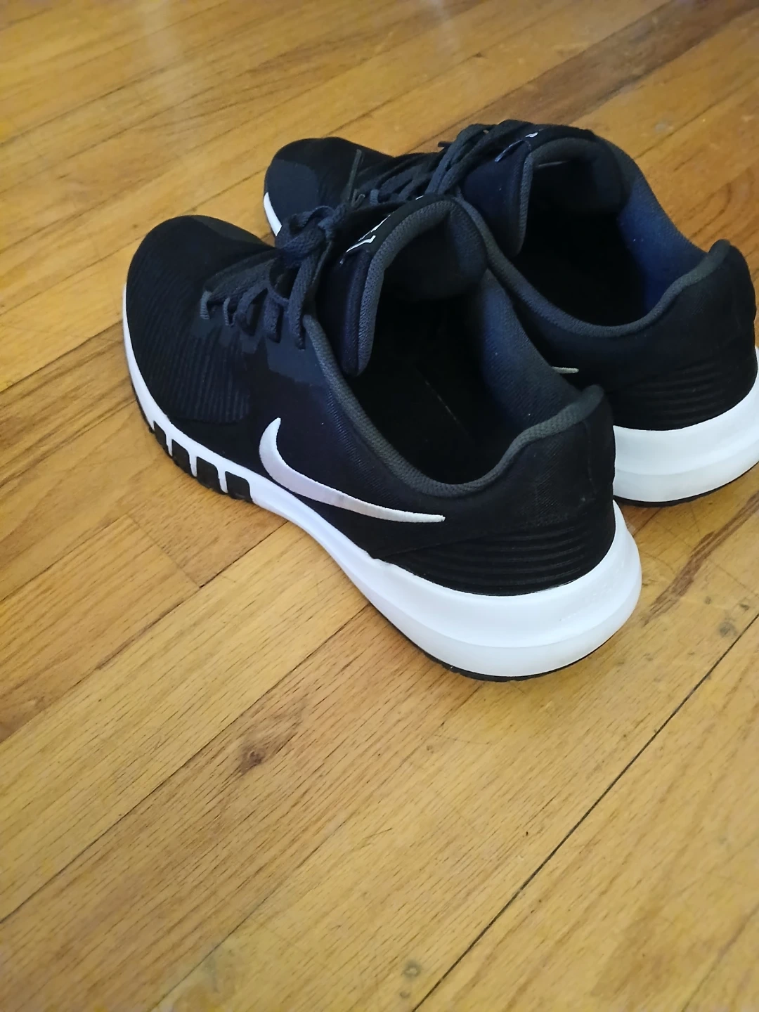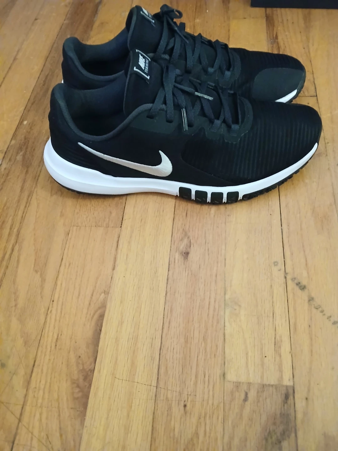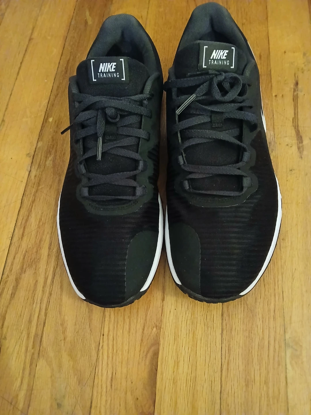 These are black Nike training shoes with a white sole. They feature a secure lace-up closure. Great for gym workouts!
