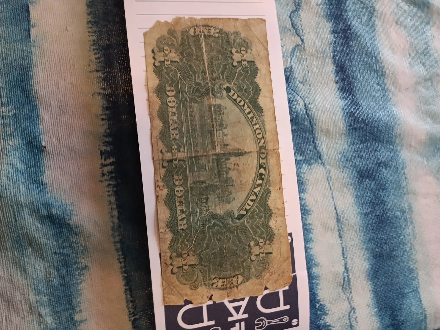Selling a one dollar bill from the Dominion of Canada. Features portraits on the front and a building design on the back. This is a vintage banknote. 1911 year. Worn and a little torn at edges.