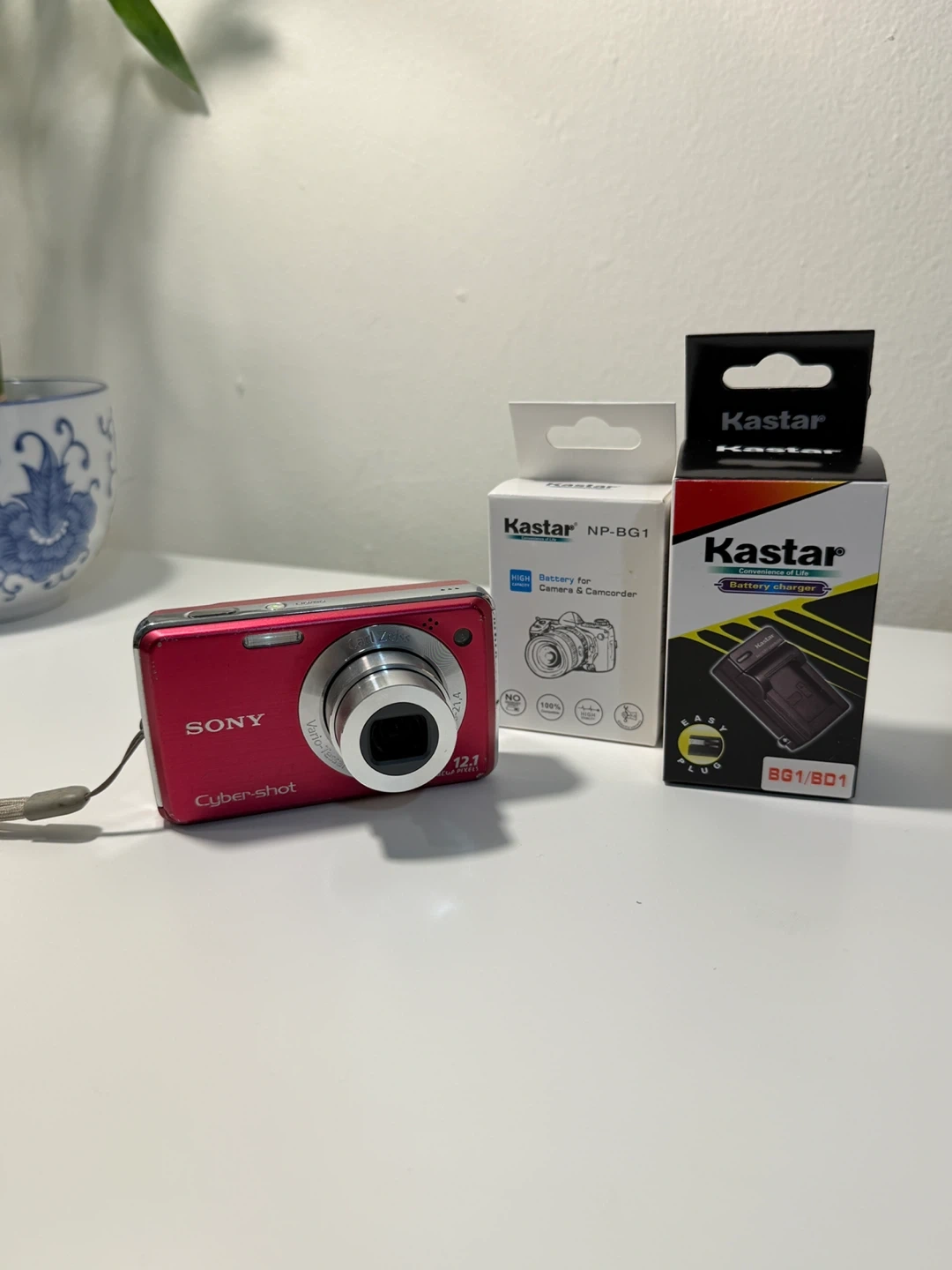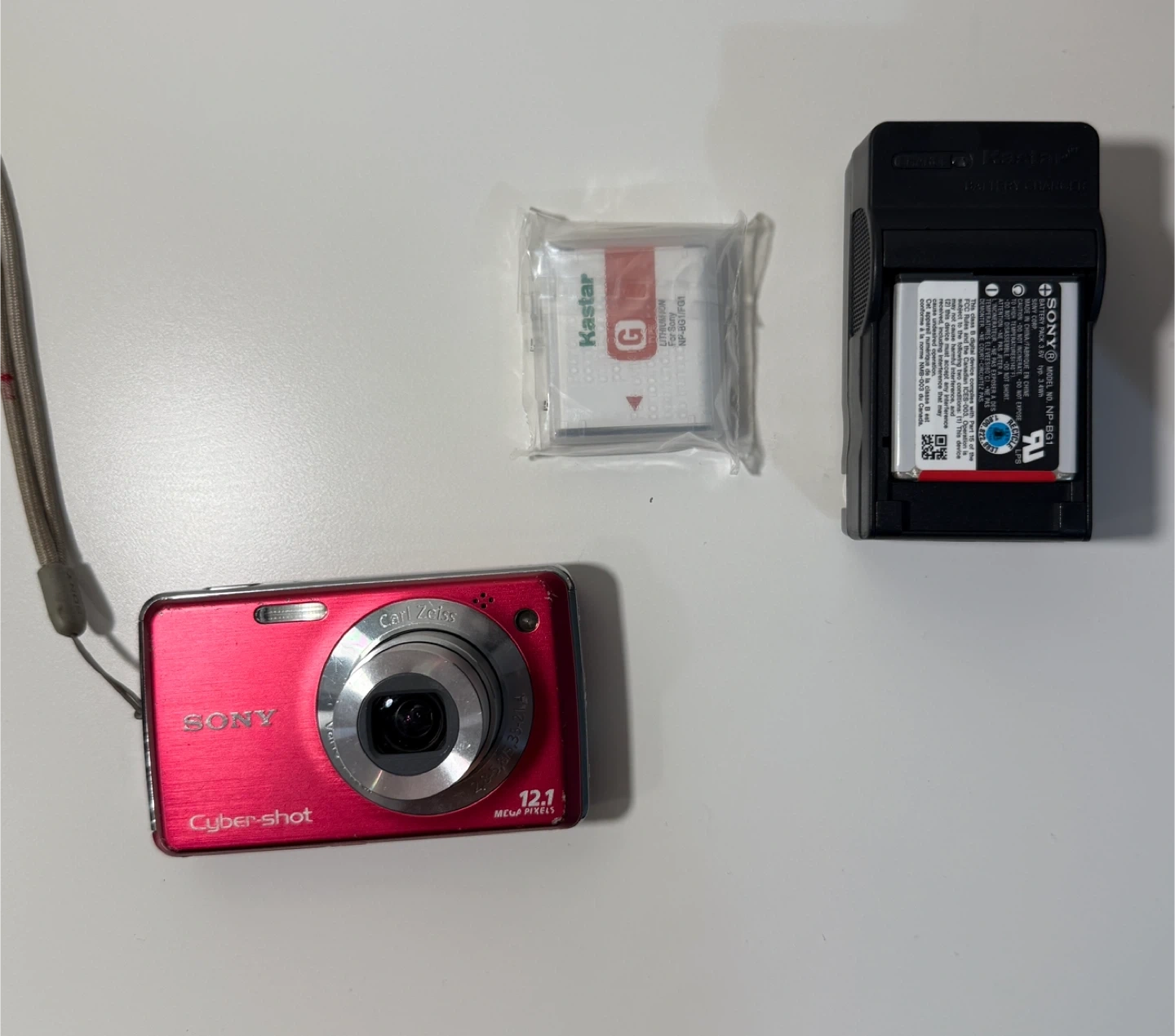 Selling a used Sony Cyber-shot DSC-W310 digital camera in red. It features 12.1 mega pixels. Included is a Kastar battery charger and battery.