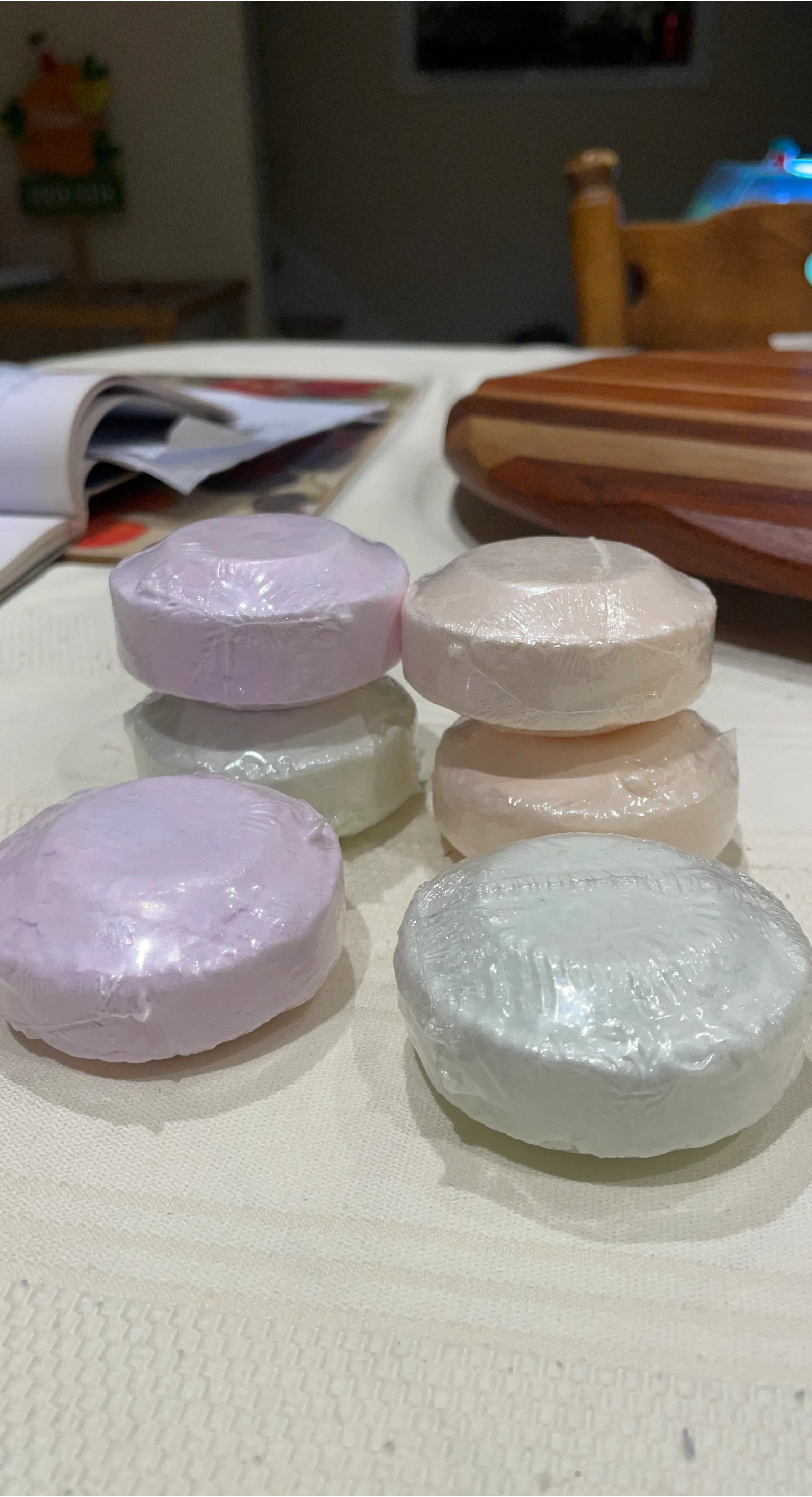 A collection of six round soaps, each individually wrapped. They come in pastel shades of pink, lavender, cream, and pale green. These soaps are perfect for personal use or to give as small gifts. Each soap is solid and appears to be a standard size.