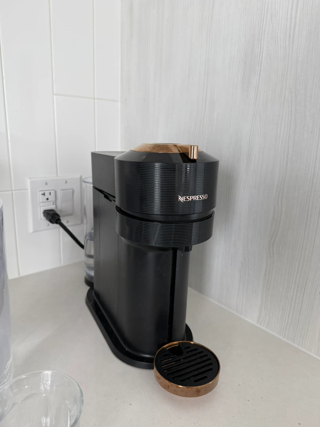 Black Nespresso VertuoPlus coffee machine with rose gold accents. Easy-to-use single-serve coffee maker. Perfect for your morning coffee routine!