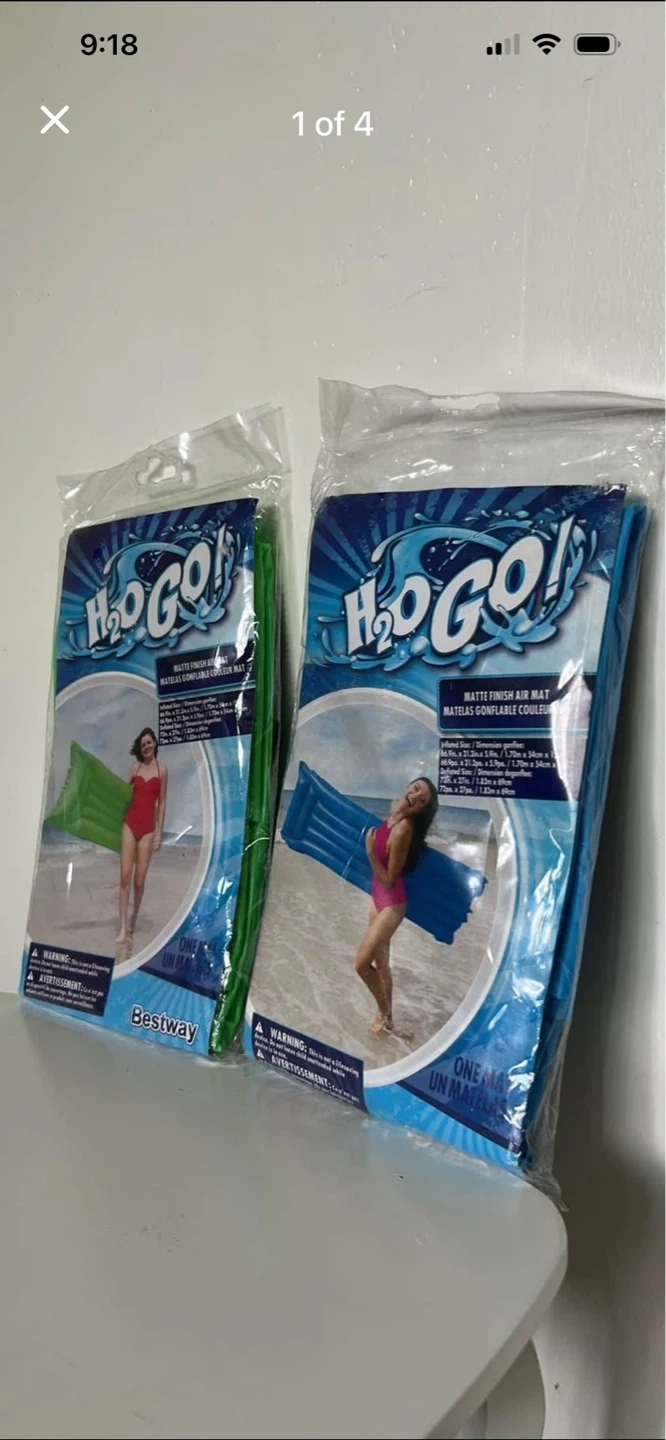 Two H2O GO! matte finish air mats are included, one in blue and one in green. The deflated size is 72" x 27" (1.83m x 69cm). These are great for relaxing by the pool or at the beach!