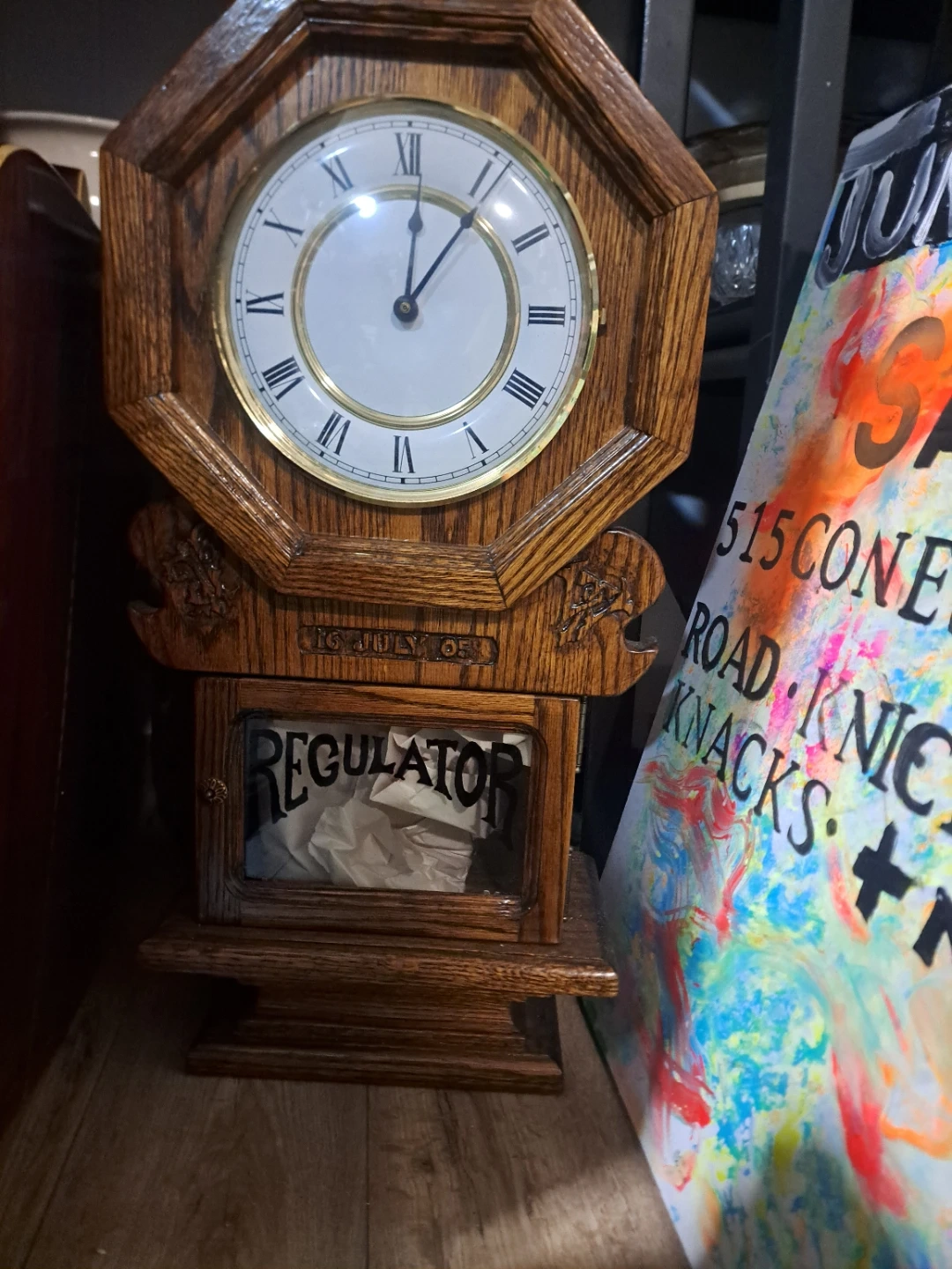 This is a lovely oak mantel clock with a regulator-style design. It features Roman numerals on the face and a glass-covered compartment at the bottom. The wood has a warm, rich finish that'll look great on any shelf. It's a classic piece that brings a touch of vintage charm to your home!