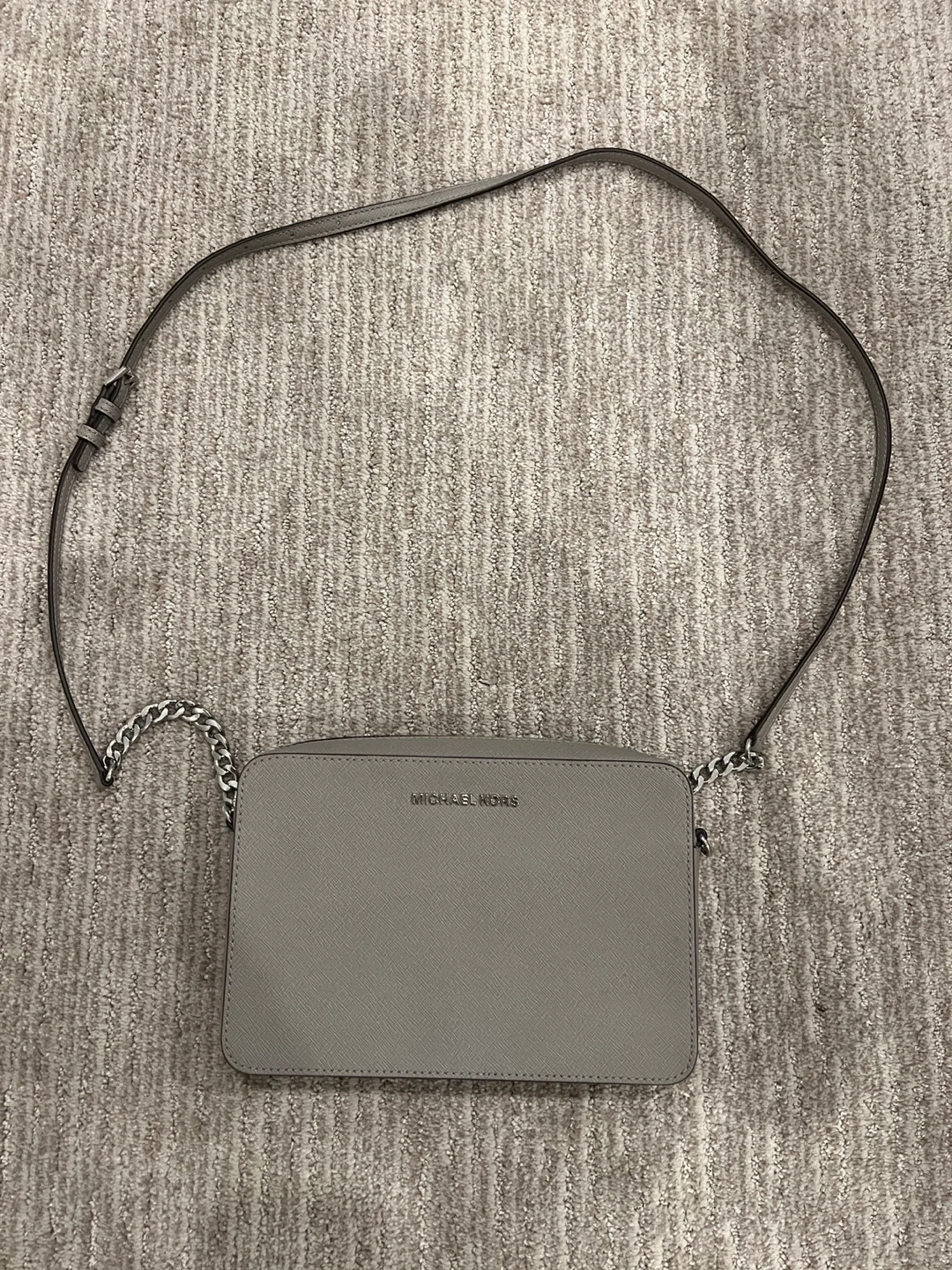 Grey leather Michael Kors crossbody bag with a zip-top closure. It has multiple interior pockets for organization. The strap is adjustable and features a chain detail.