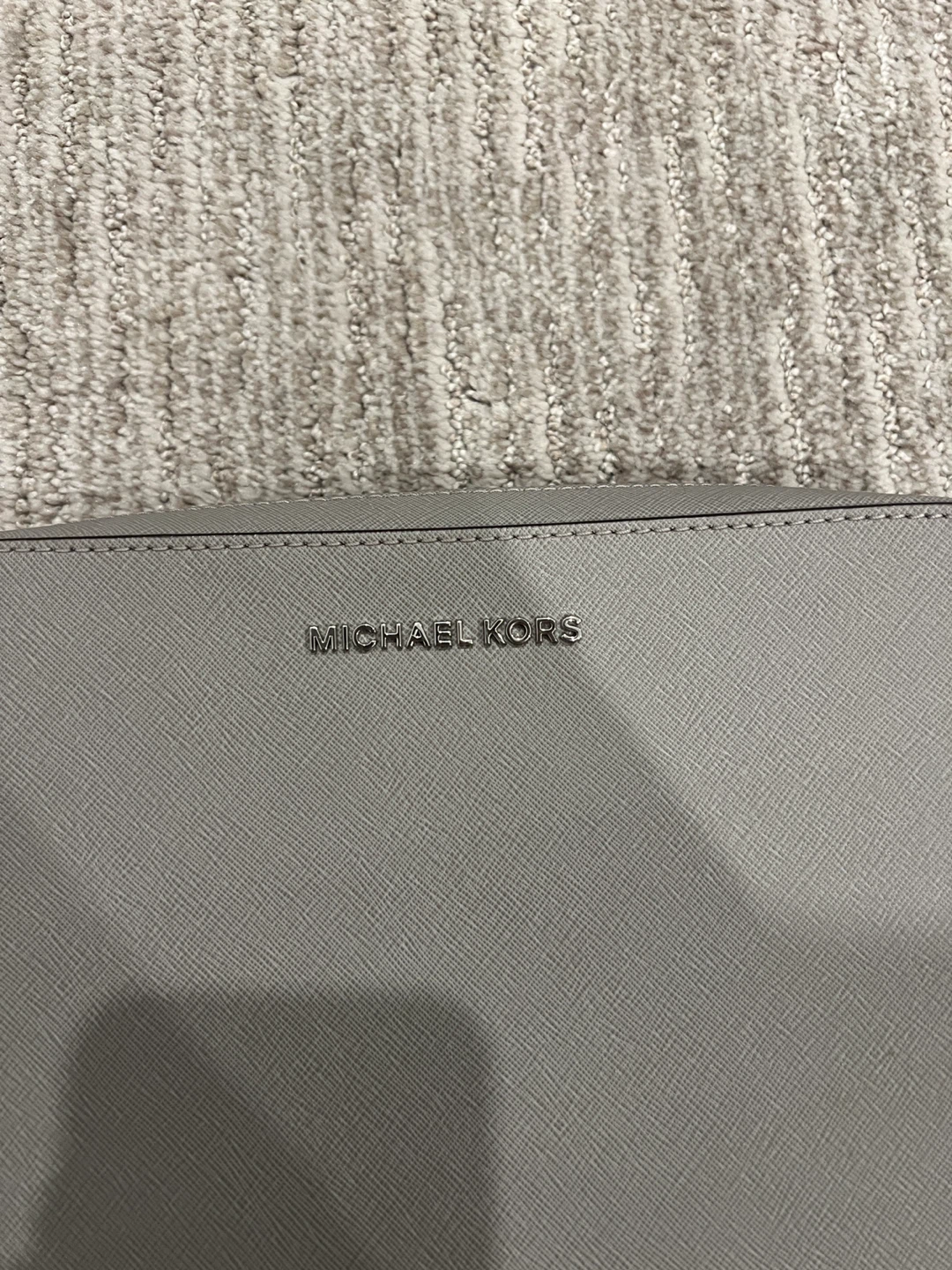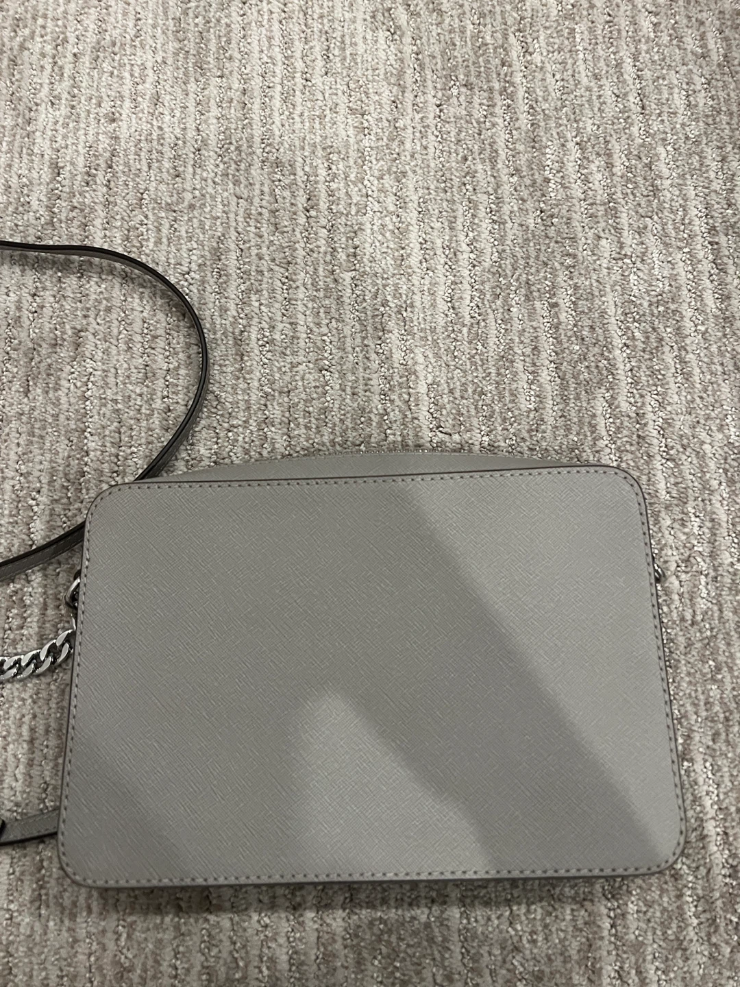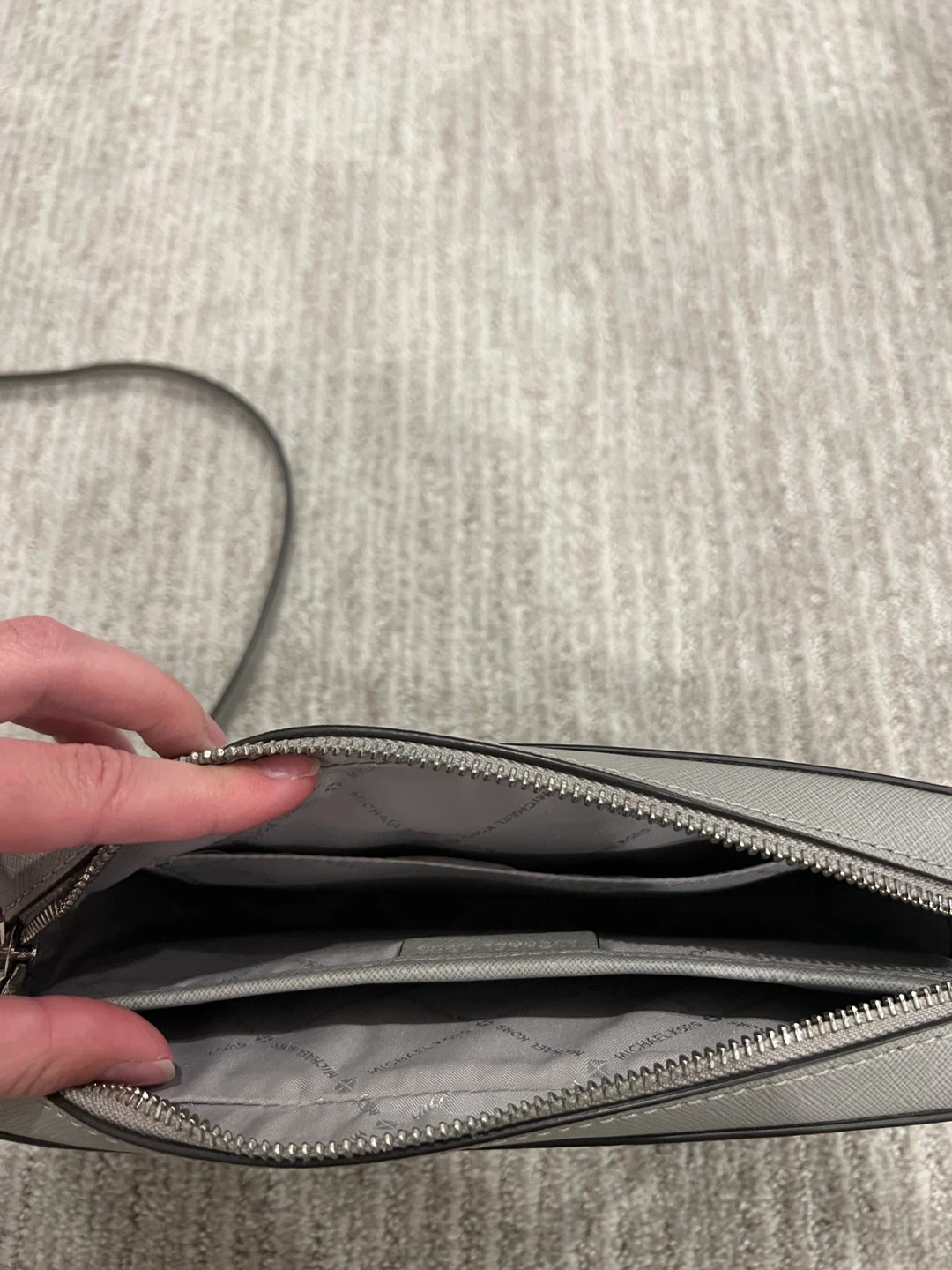 Grey leather Michael Kors crossbody bag with a zip-top closure. It has multiple interior pockets for organization. The strap is adjustable and features a chain detail.