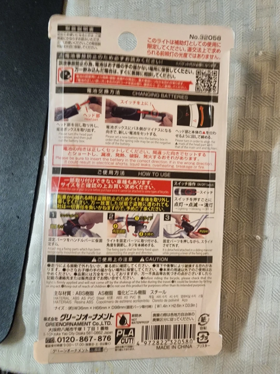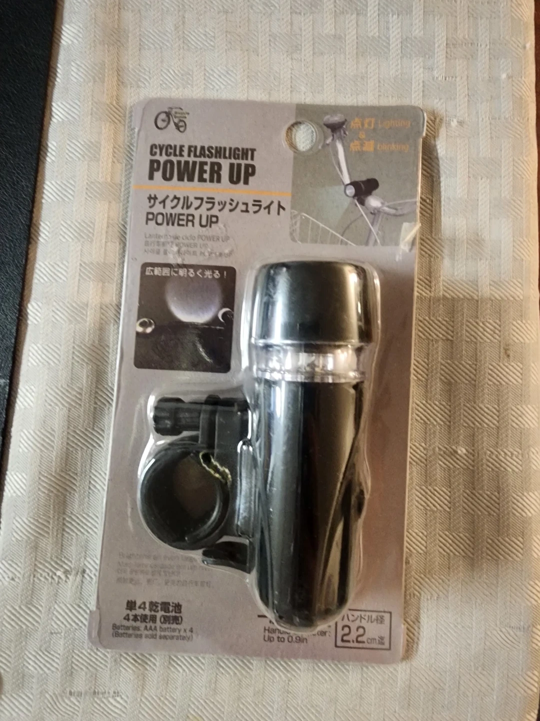 This is a GREENORNAMENT Cycle Flashlight POWER UP. It's a black bicycle light. The handlebar mount fits up to 2.2cm.