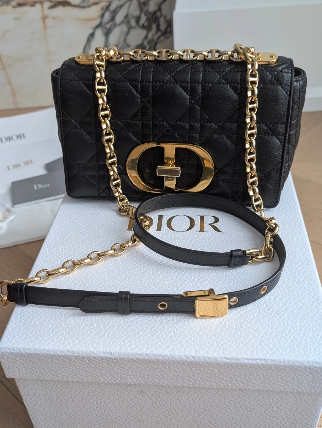 Authentic Small Dior Caro Bag with Black Supple Cannage Calfskin. Has minor scuff only on the edges of the actual flap and inside of the flap. Hardware has some discoloration. The strap is adjustable to get you the perfect length.