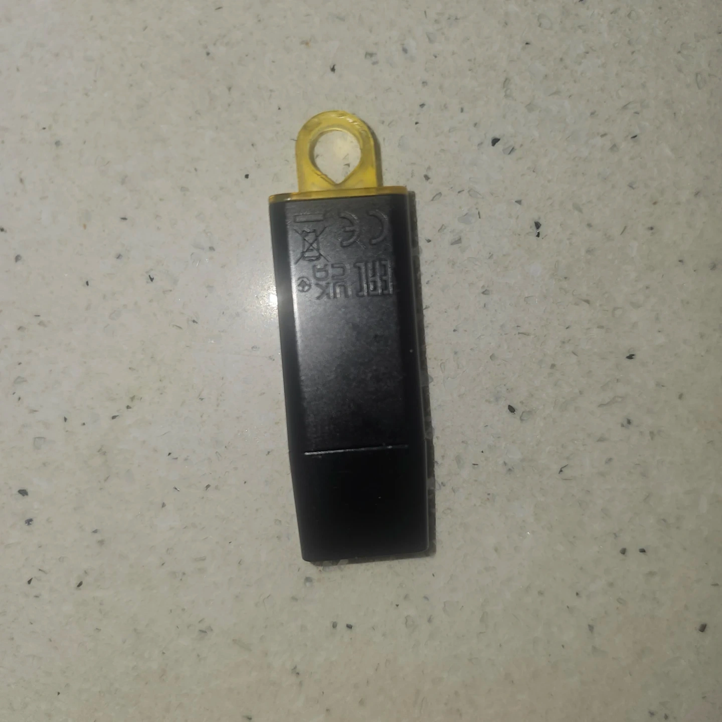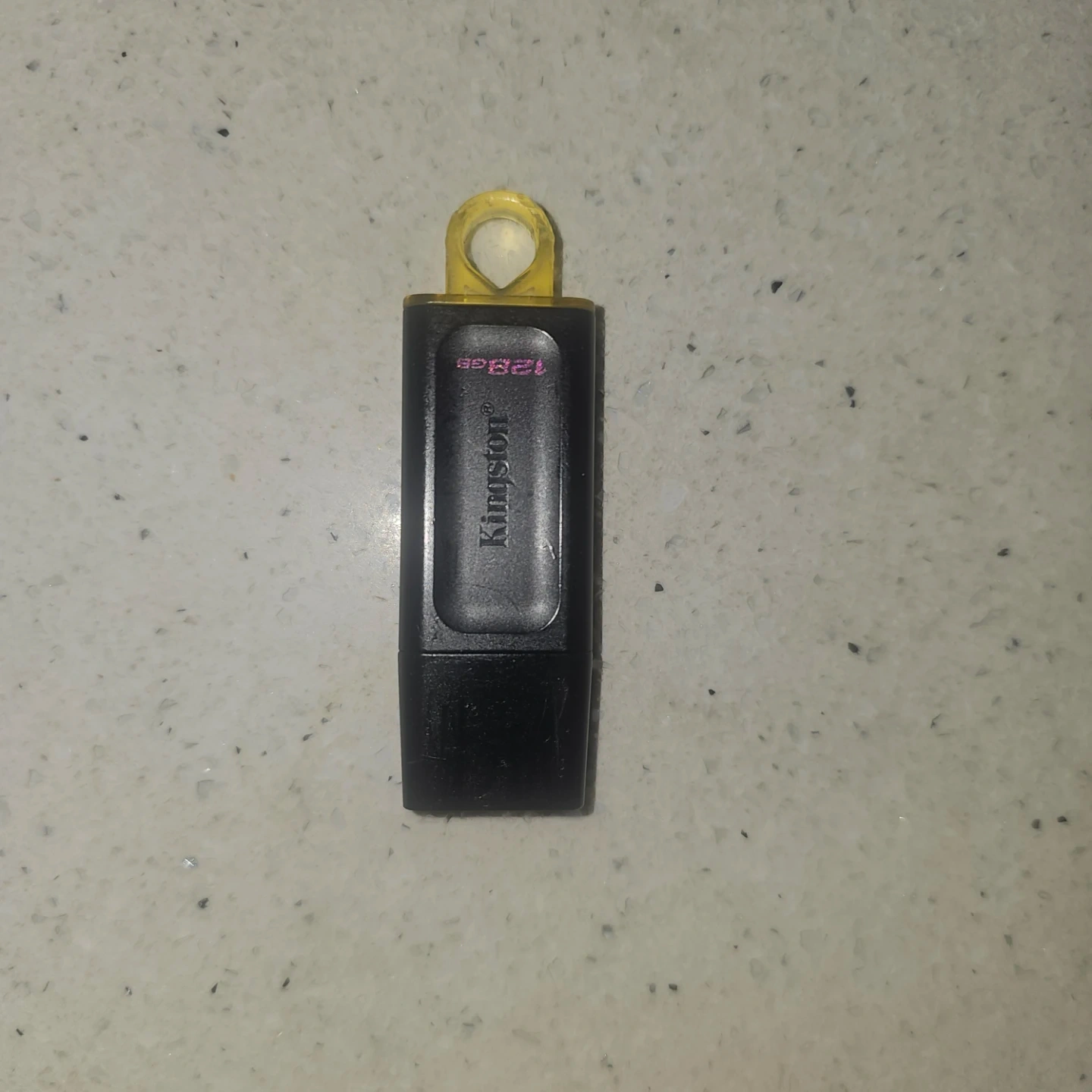 Kingston 128GB USB flash drive. Black casing with a yellow loop for a keychain. It's useful for storing and transferring files on the go. Never used it fully empty