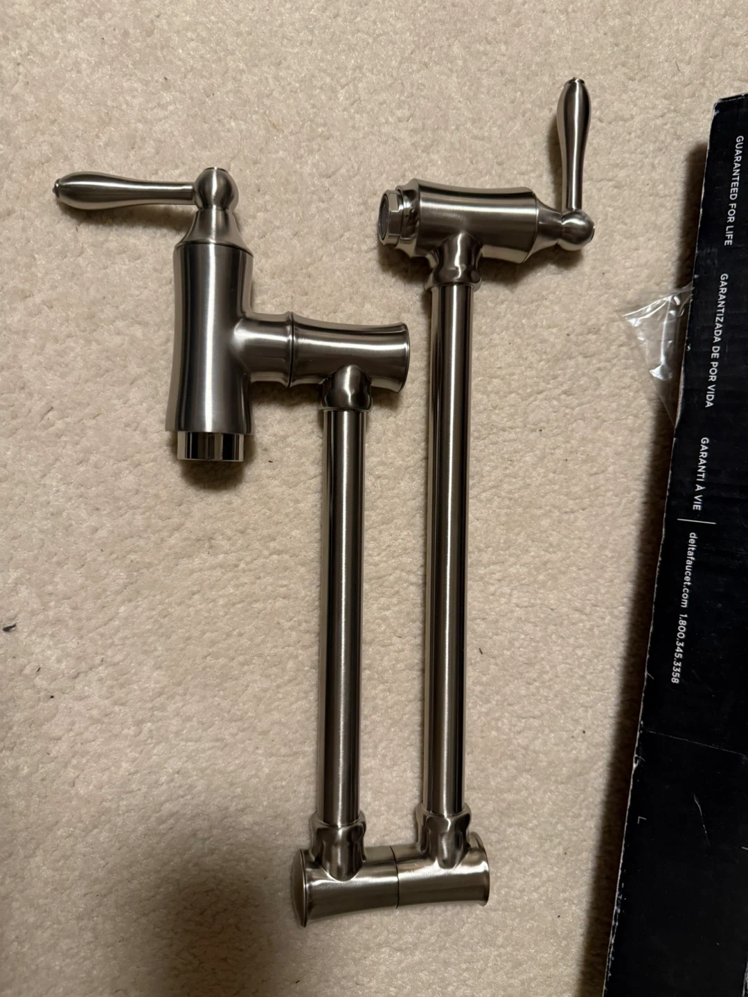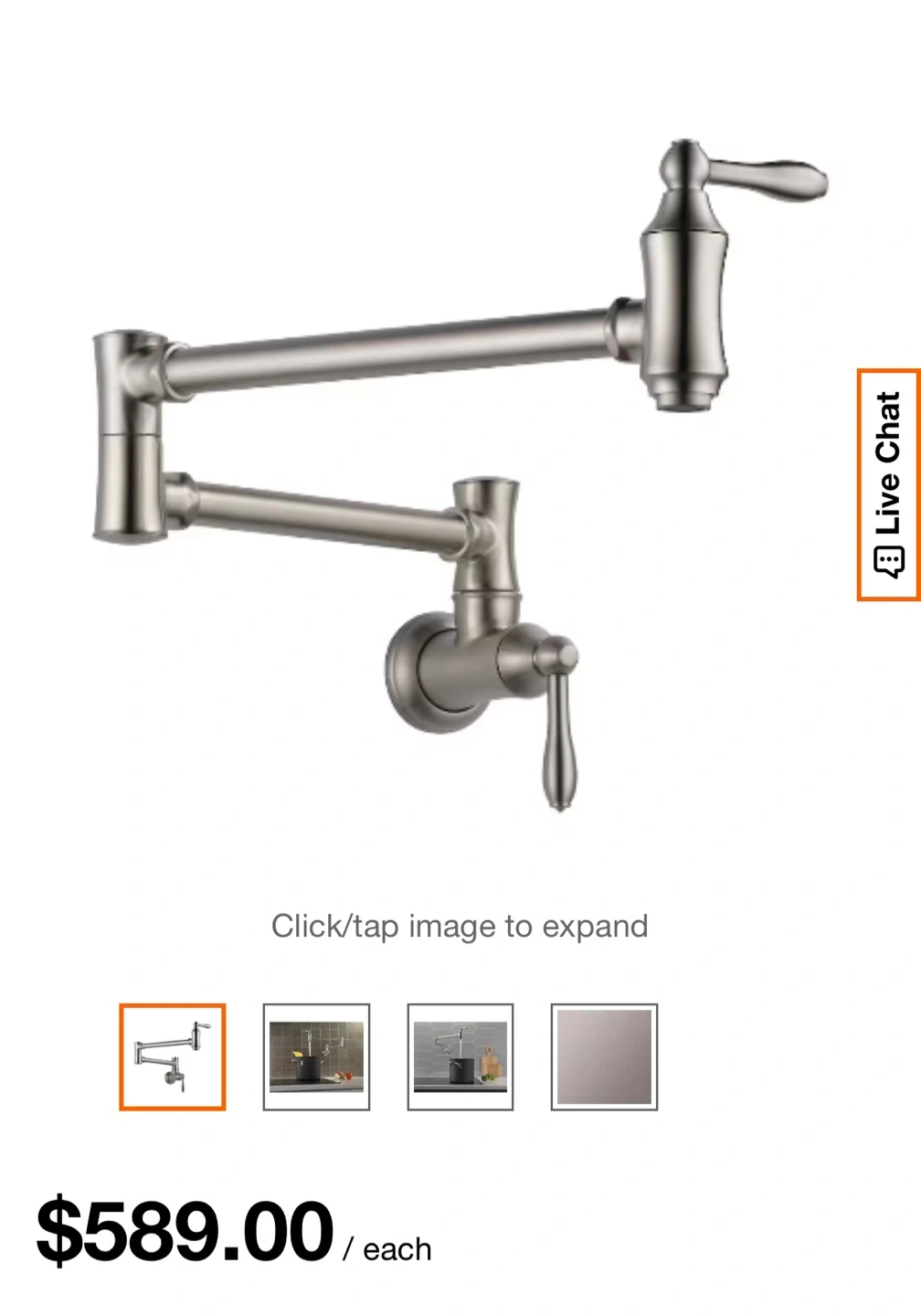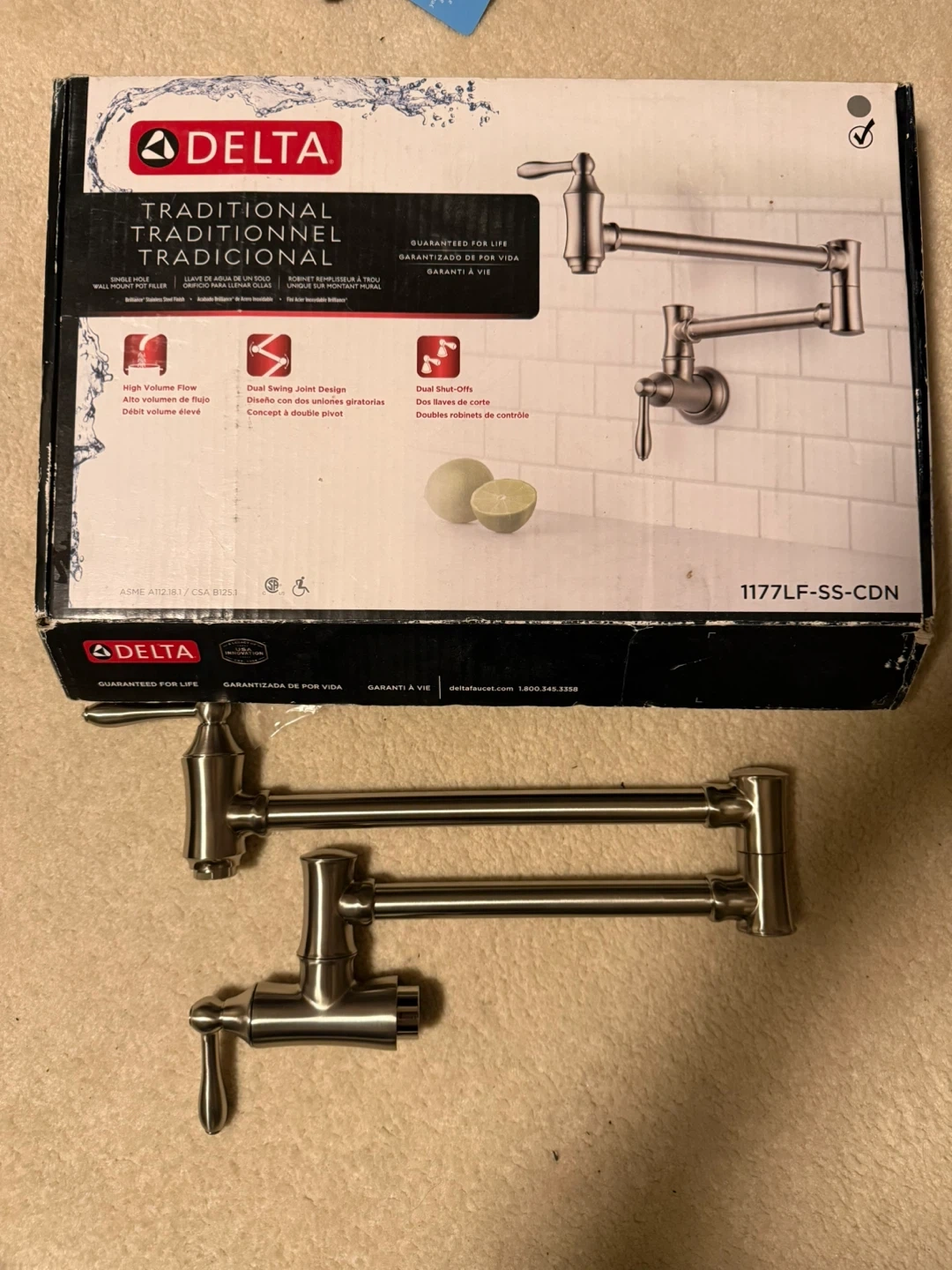 Delta pot filler faucet with dual shut-off design. High volume flow and dual swing joint. Stainless steel finish included. This faucet's articulated arms make filling large pots easy!