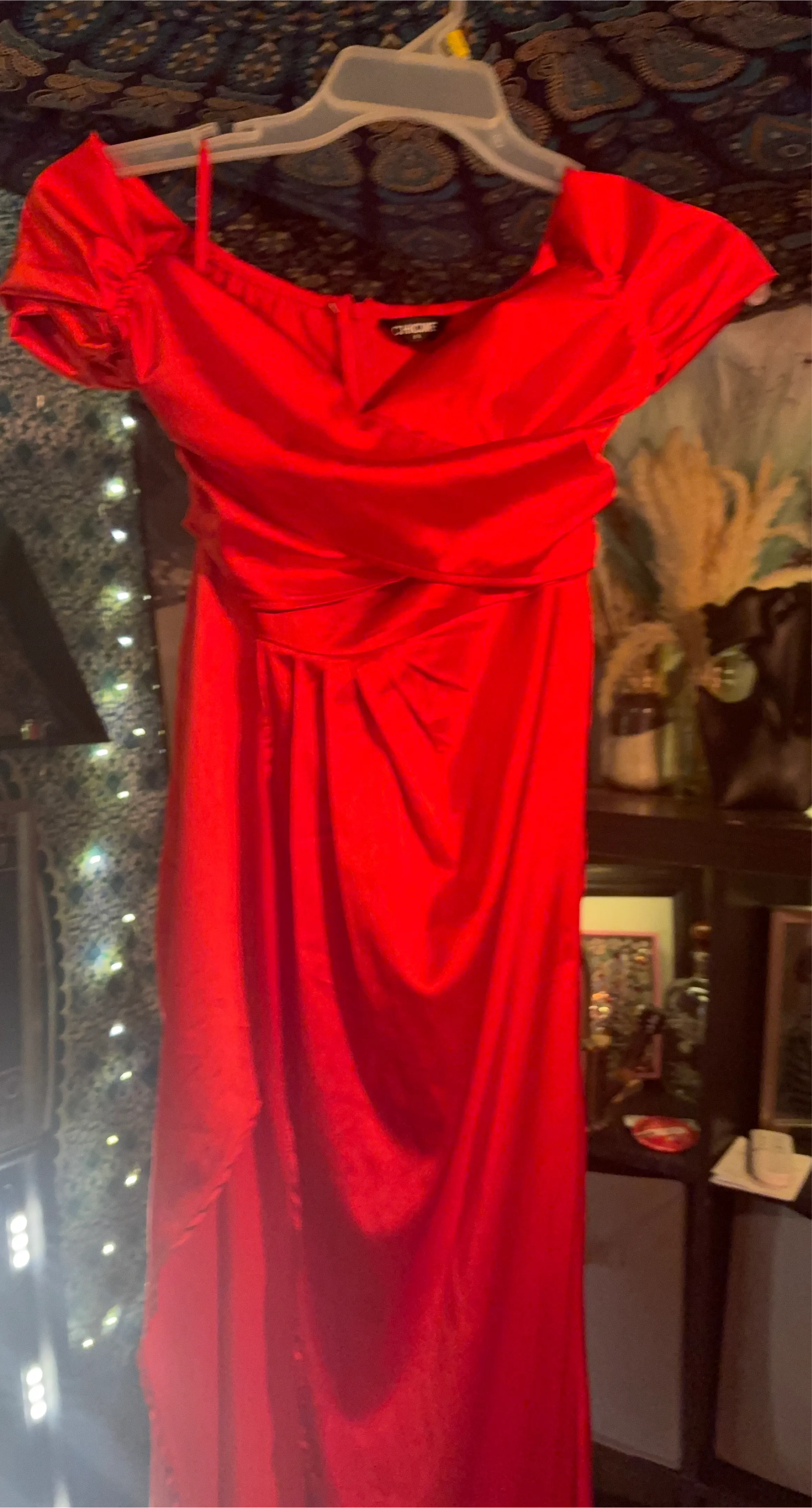 This is a vibrant red maxi dress from CHICME. It features a flattering silhouette and is perfect for a special occasion or a night out. The dress is in great condition and ready to wear!