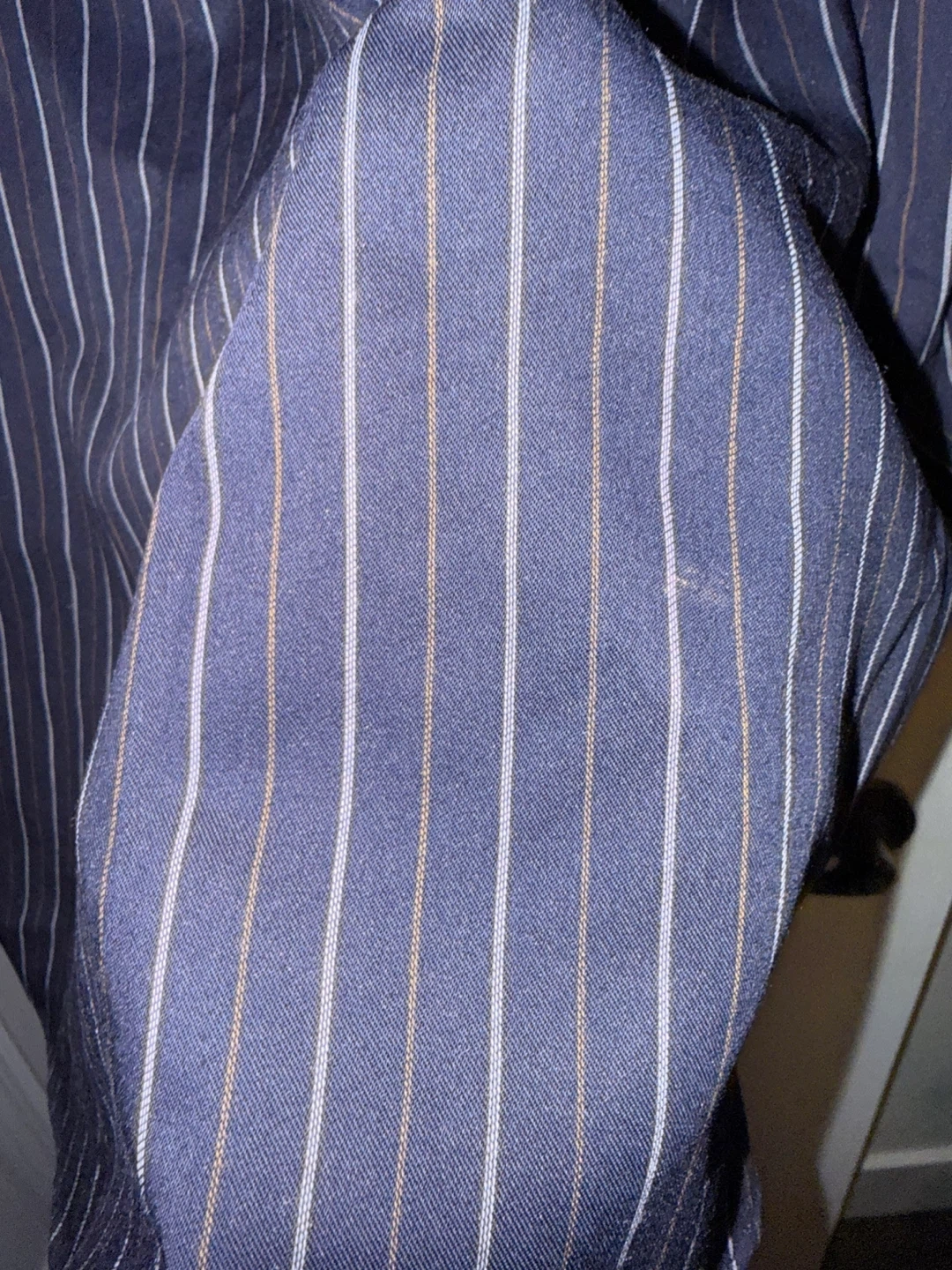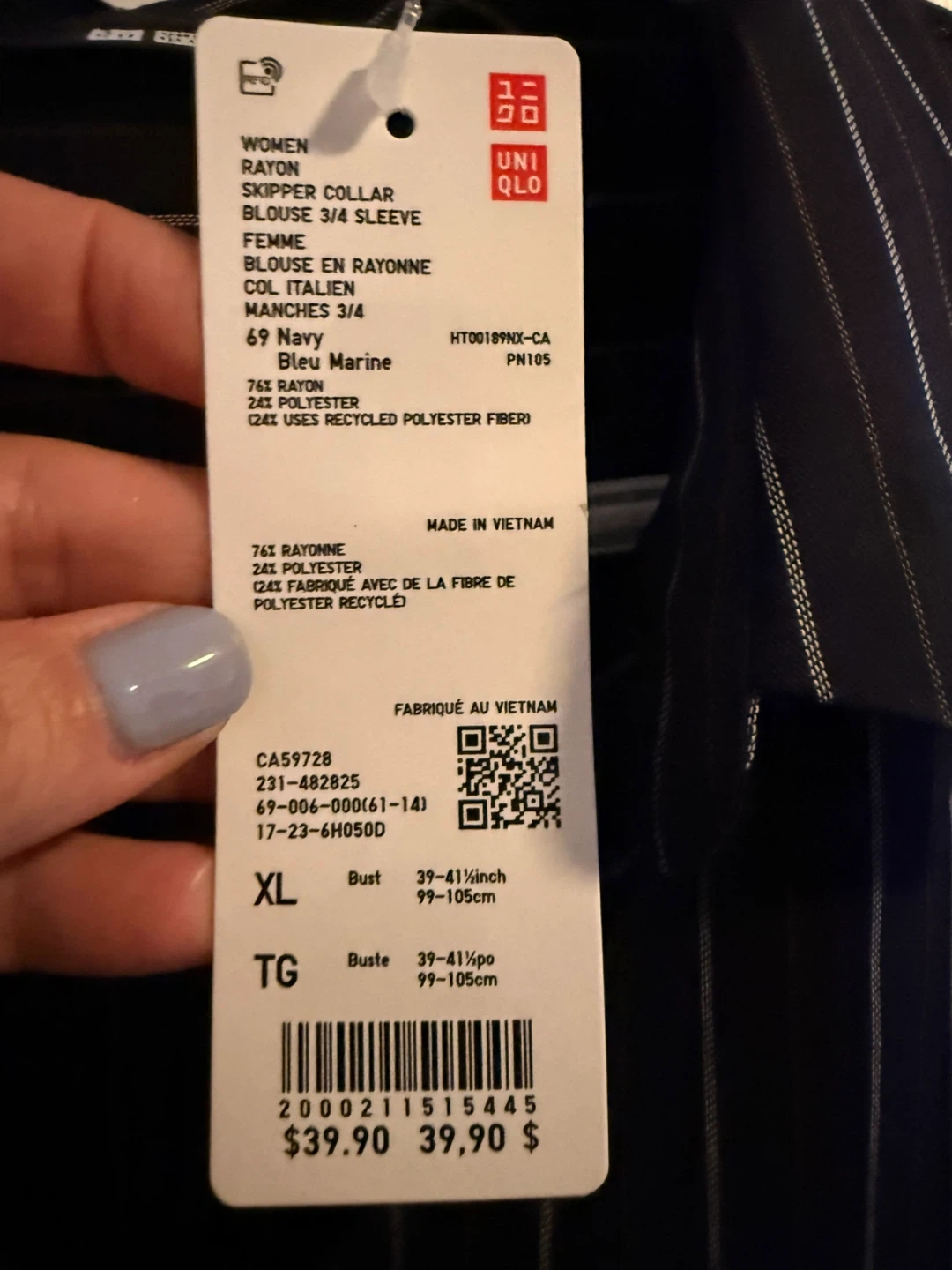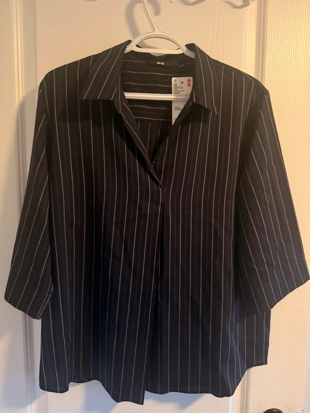 Women's UNIQLO blouse in navy blue with white and brown pinstripes. It's a 3/4 sleeve skipper collar style made from rayon and polyester. The size is XL. Perfect for casual or work wear! New